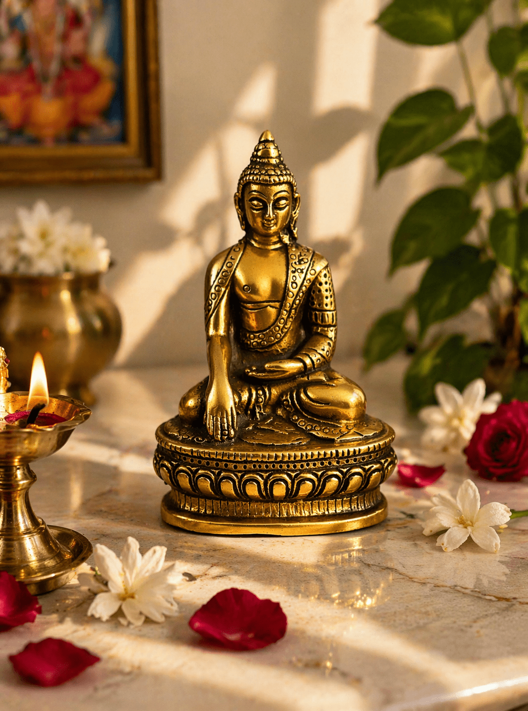 Bring calmness and positive energy into your surroundings with this beautifully crafted Aluminum Buddha Statue. Designed with fine detailing and a rich antique gold finish, this 6-inch idol captures the serene expression and meditative posture of Lord Buddha, symbolizing peace, mindfulness, and spiritual harmony.