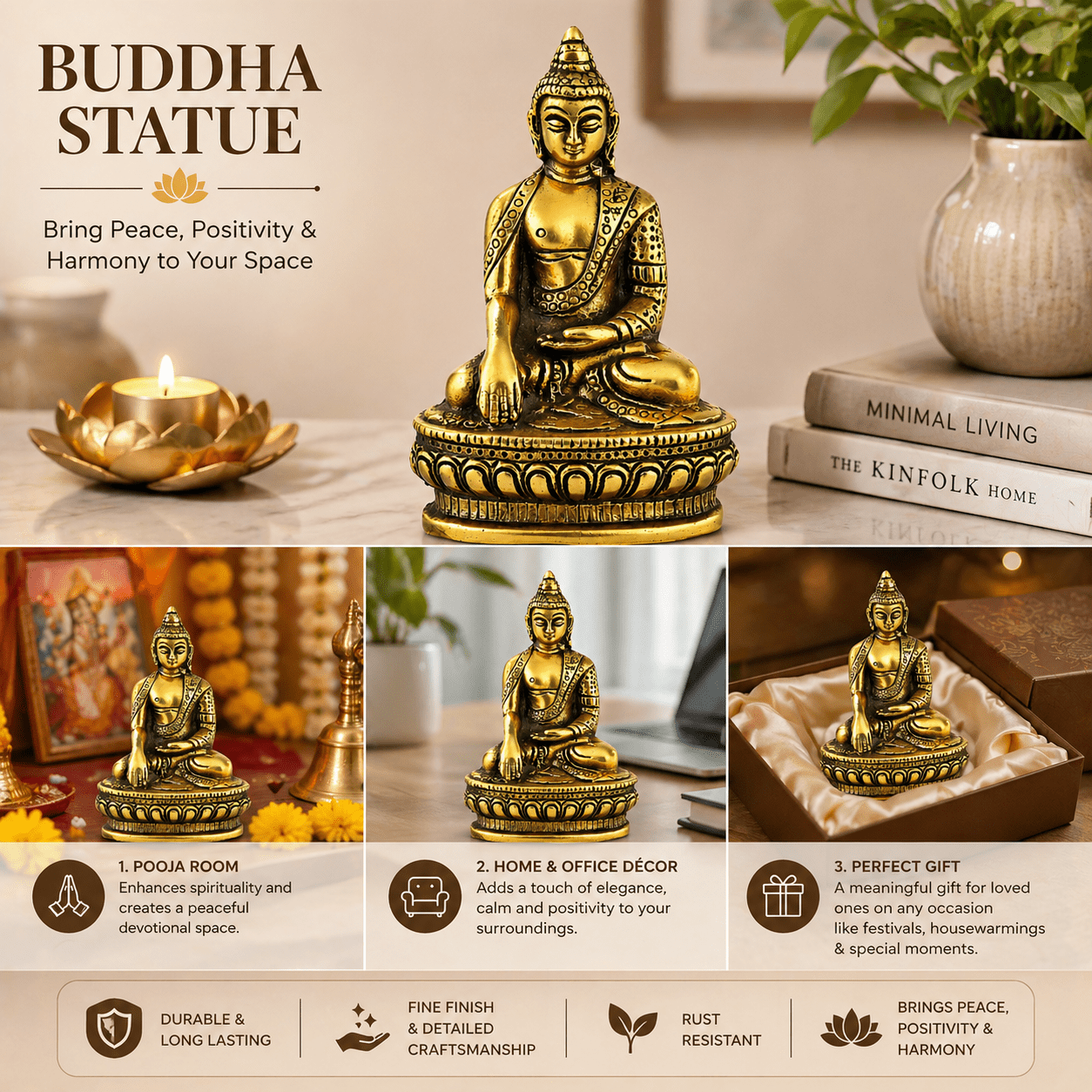 The statue depicts Buddha in a meditative pose, believed to promote relaxation, reduce stress, and create a peaceful atmosphere. Whether placed in your living room, bedroom, office desk, or meditation space, it acts as a calming presence and an elegant decorative piece.