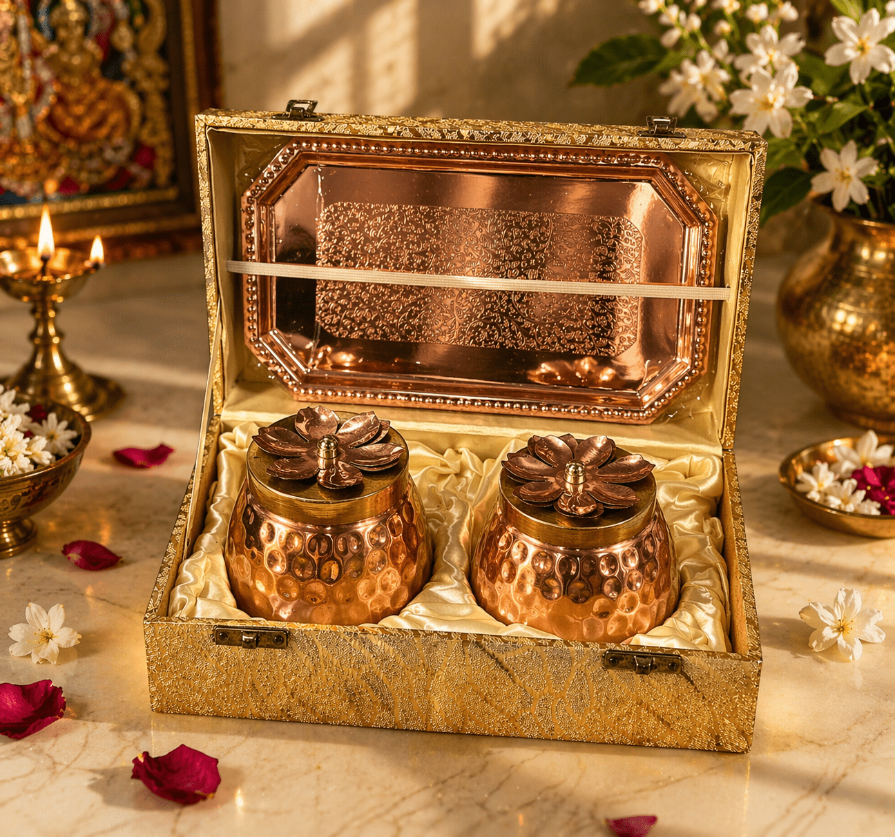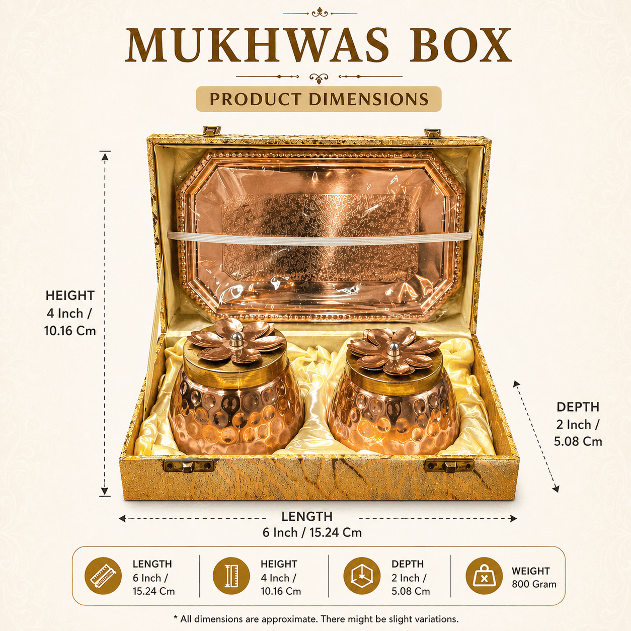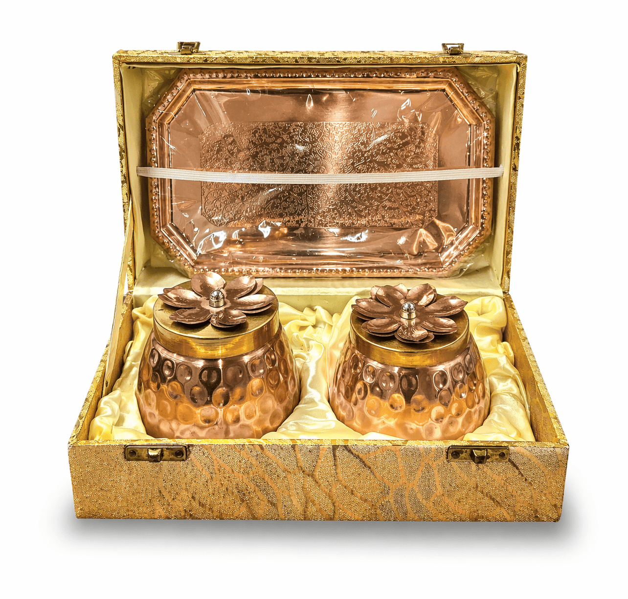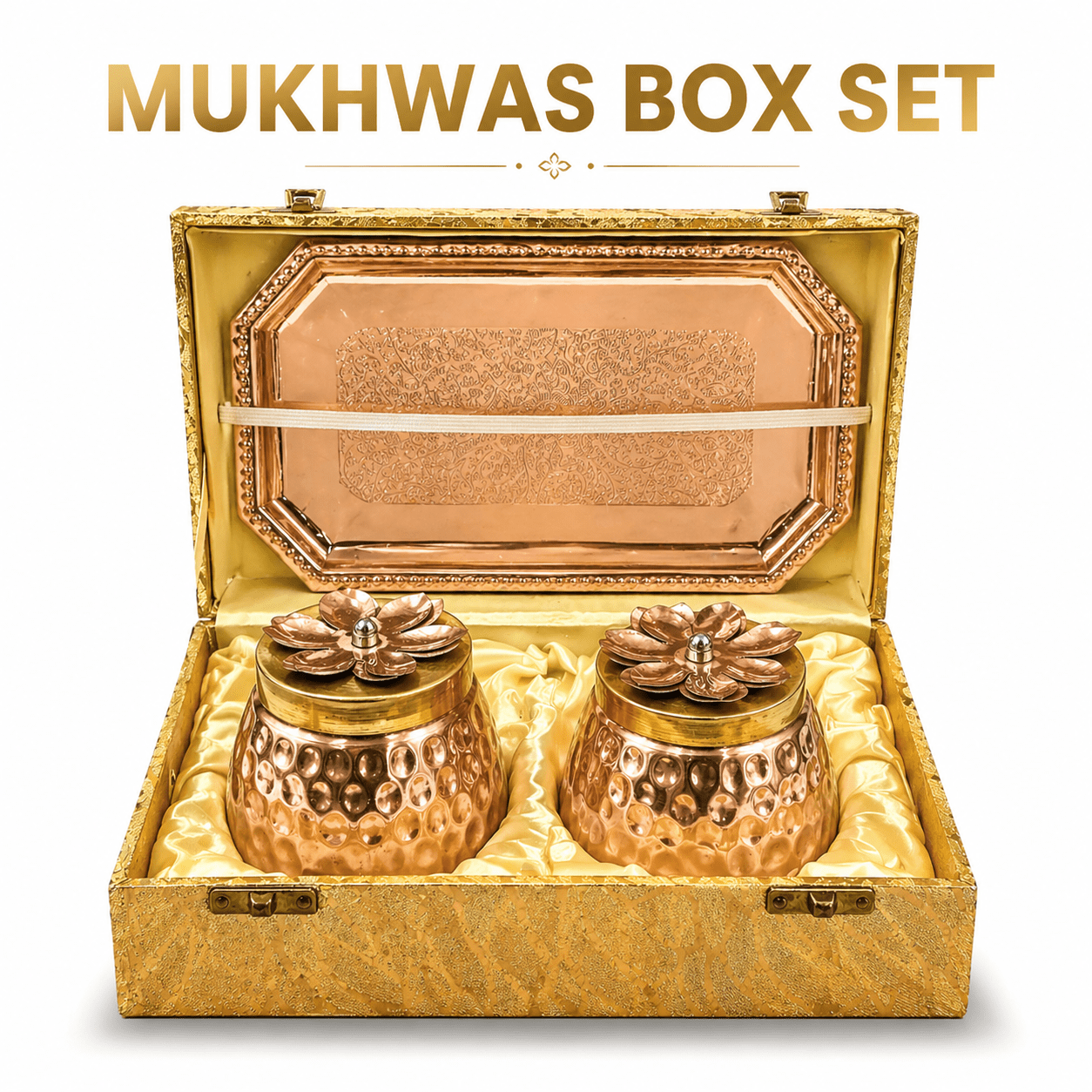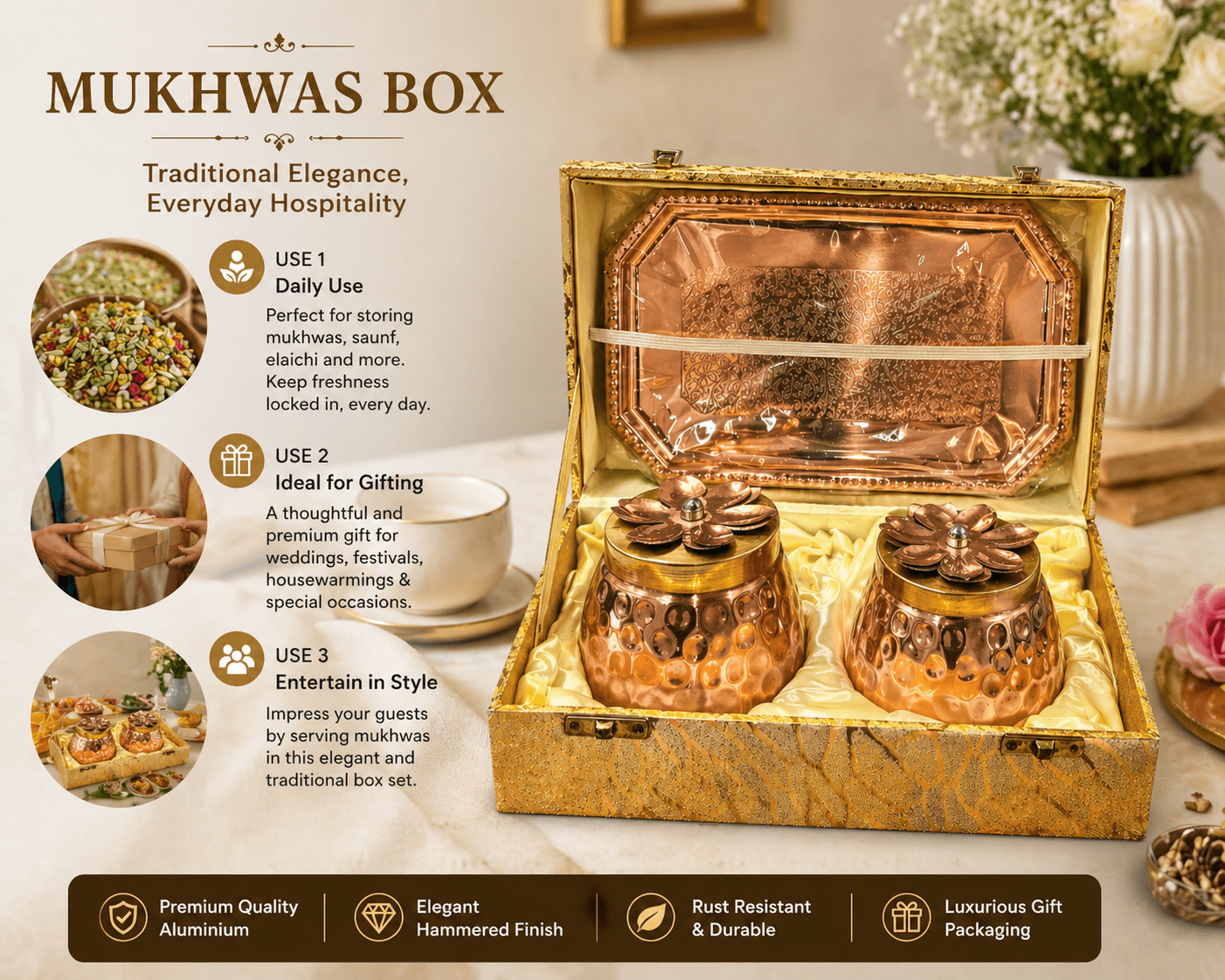 Add elegance and tradition to your hospitality with this beautifully crafted Premium Aluminium Mukwas Box Set with Tray. Designed with a stunning hammered finish and a rich copper-tone shine, this set includes two storage containers and a decorative serving tray, all presented in luxurious gift packaging. It is the perfect combination of functionality and aesthetic appeal, making it ideal for both everyday use and special occasions.