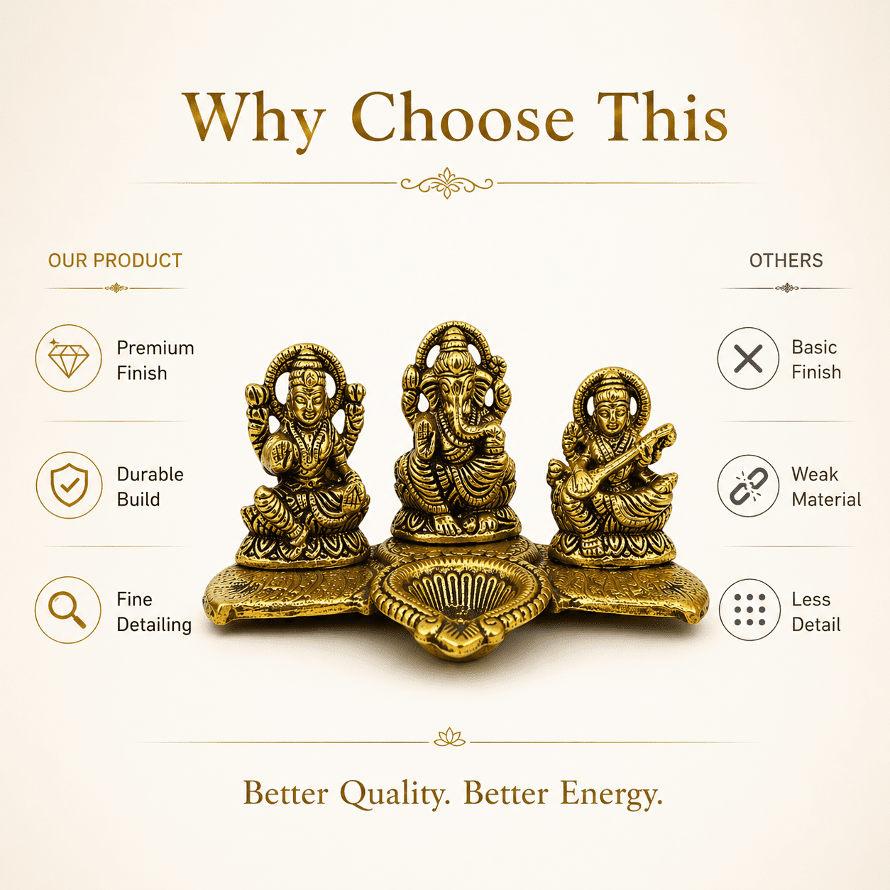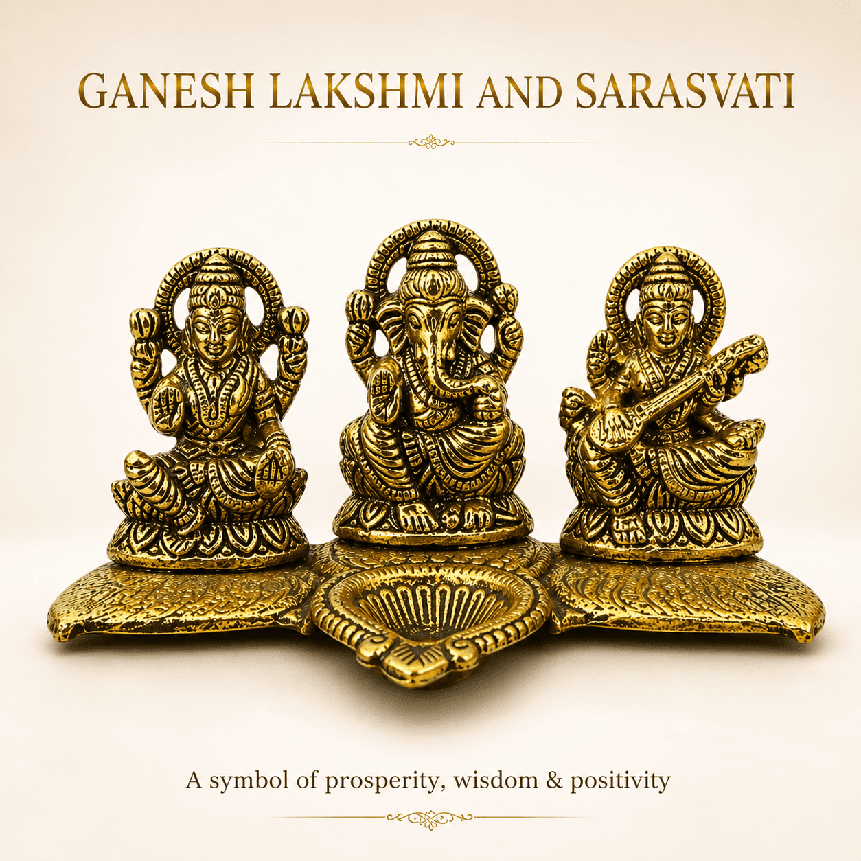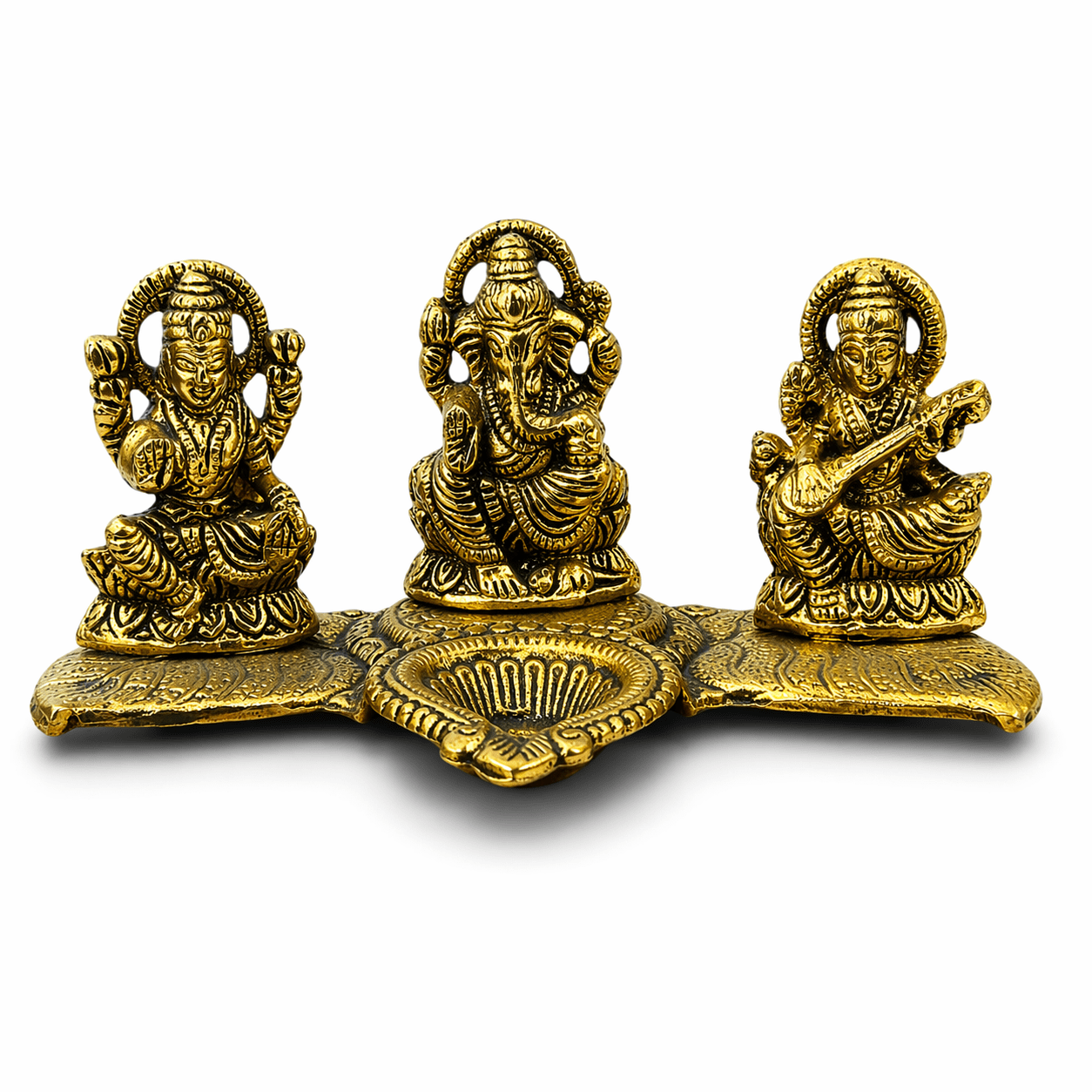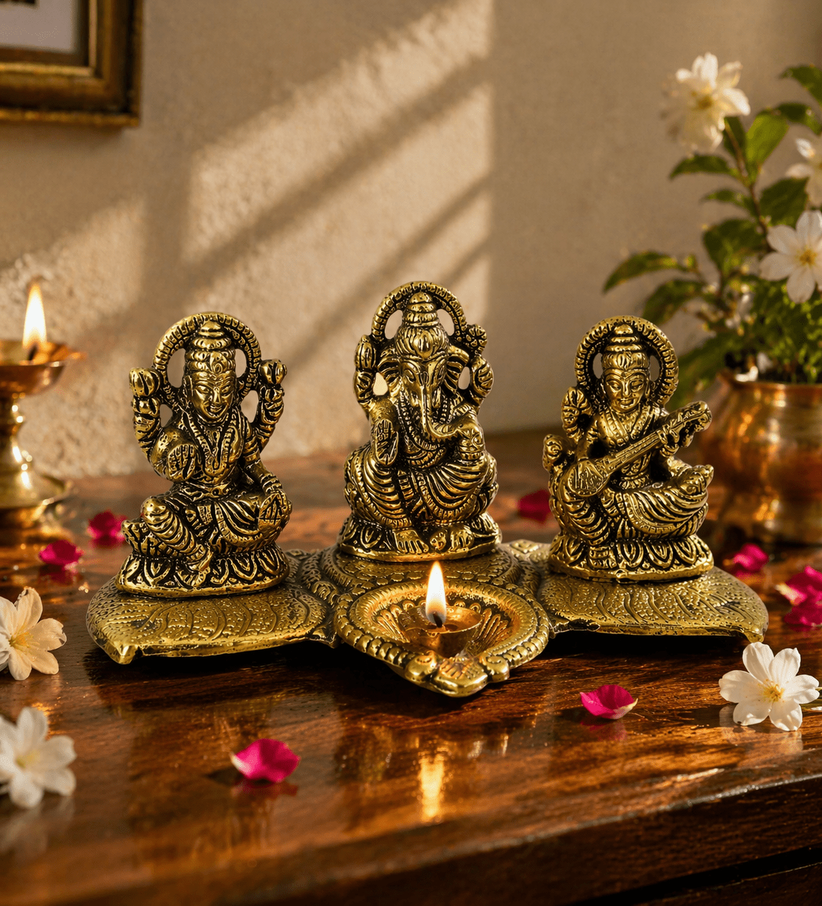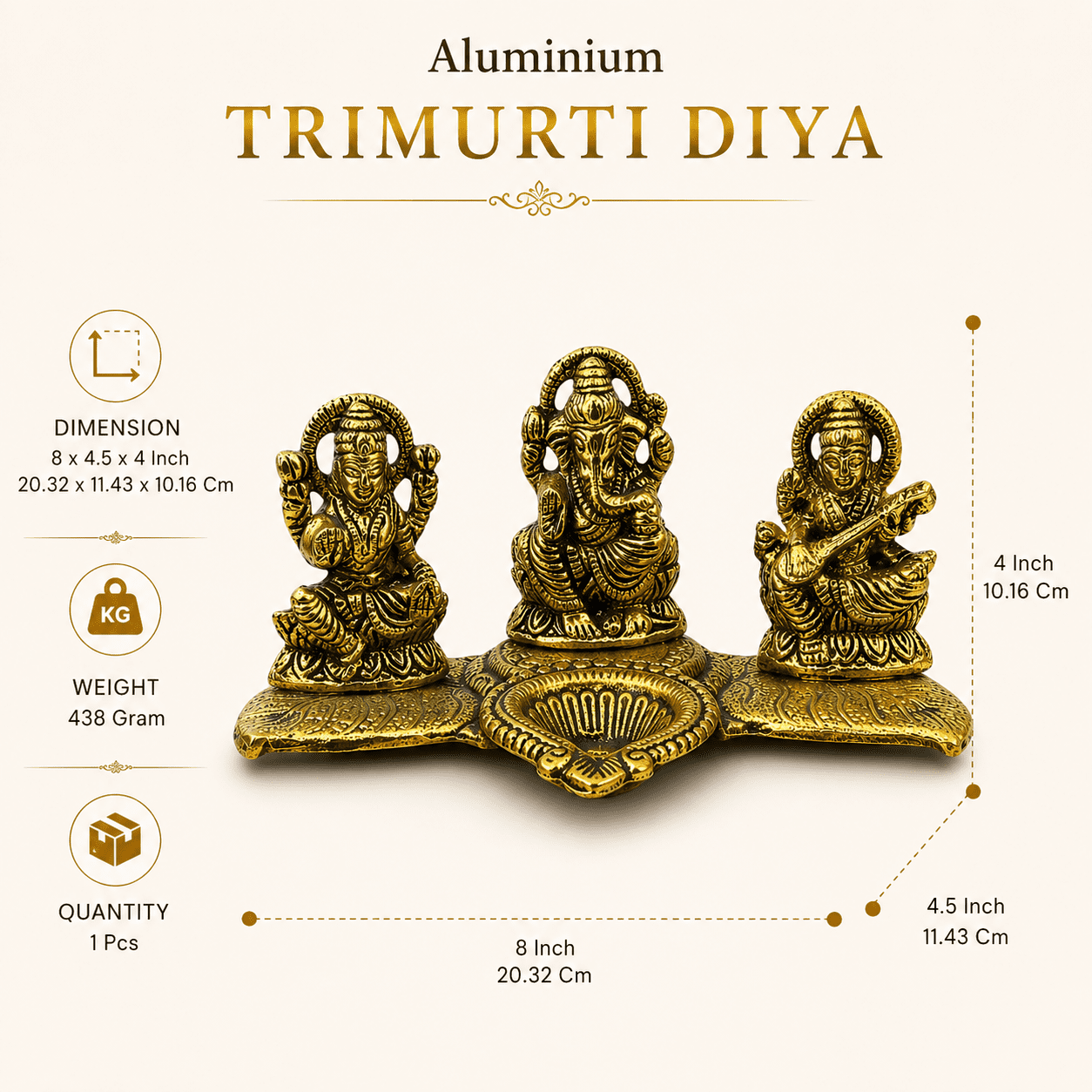 Crafted from high-quality aluminium, this Trimurti diya is lightweight yet durable, ensuring long-lasting shine without rust or corrosion. Each deity is finely sculpted—Lord Ganesha represents success and obstacle removal, Goddess Lakshmi brings wealth and prosperity, and Goddess Saraswati symbolizes knowledge and creativity. Together, they create a powerful spiritual aura in any space.