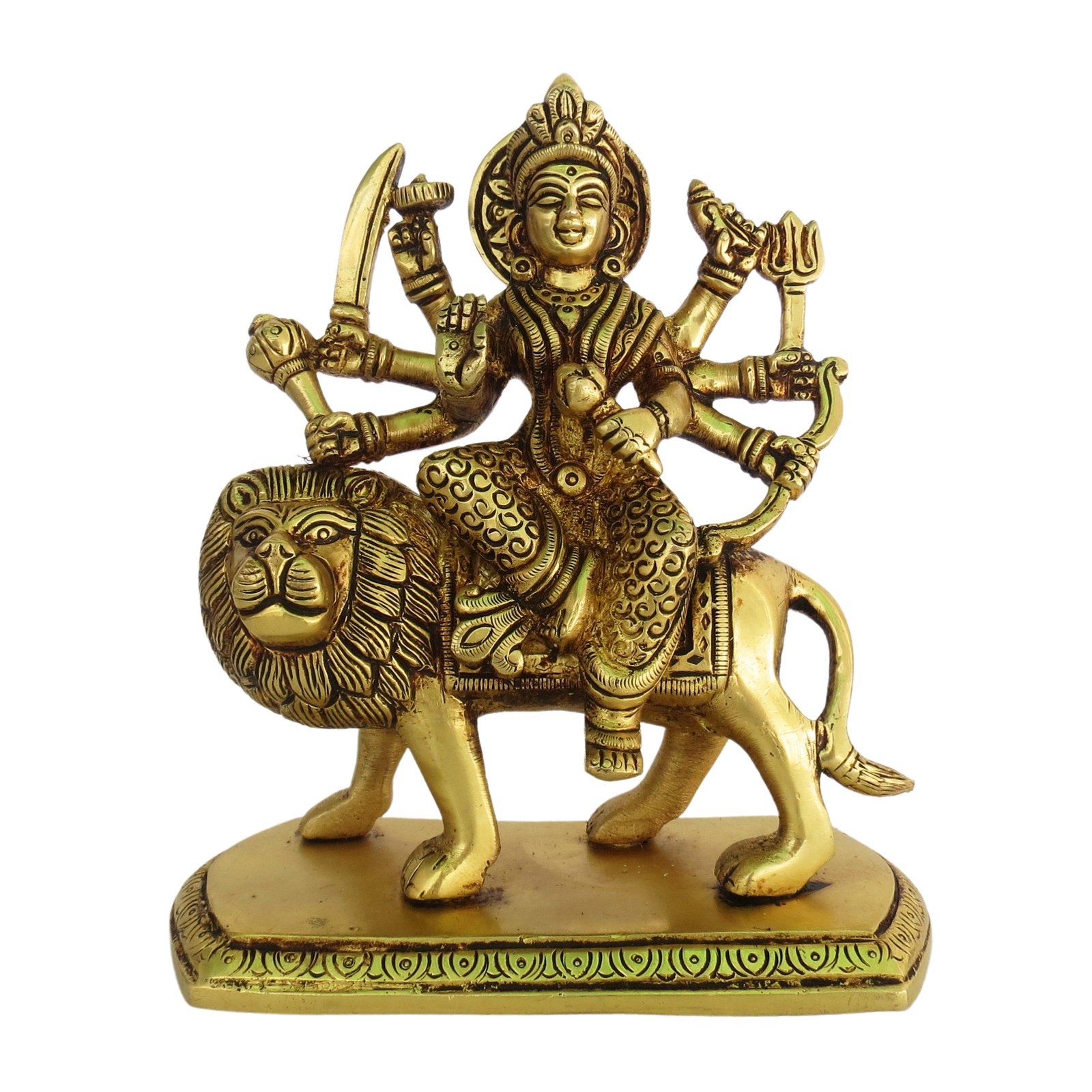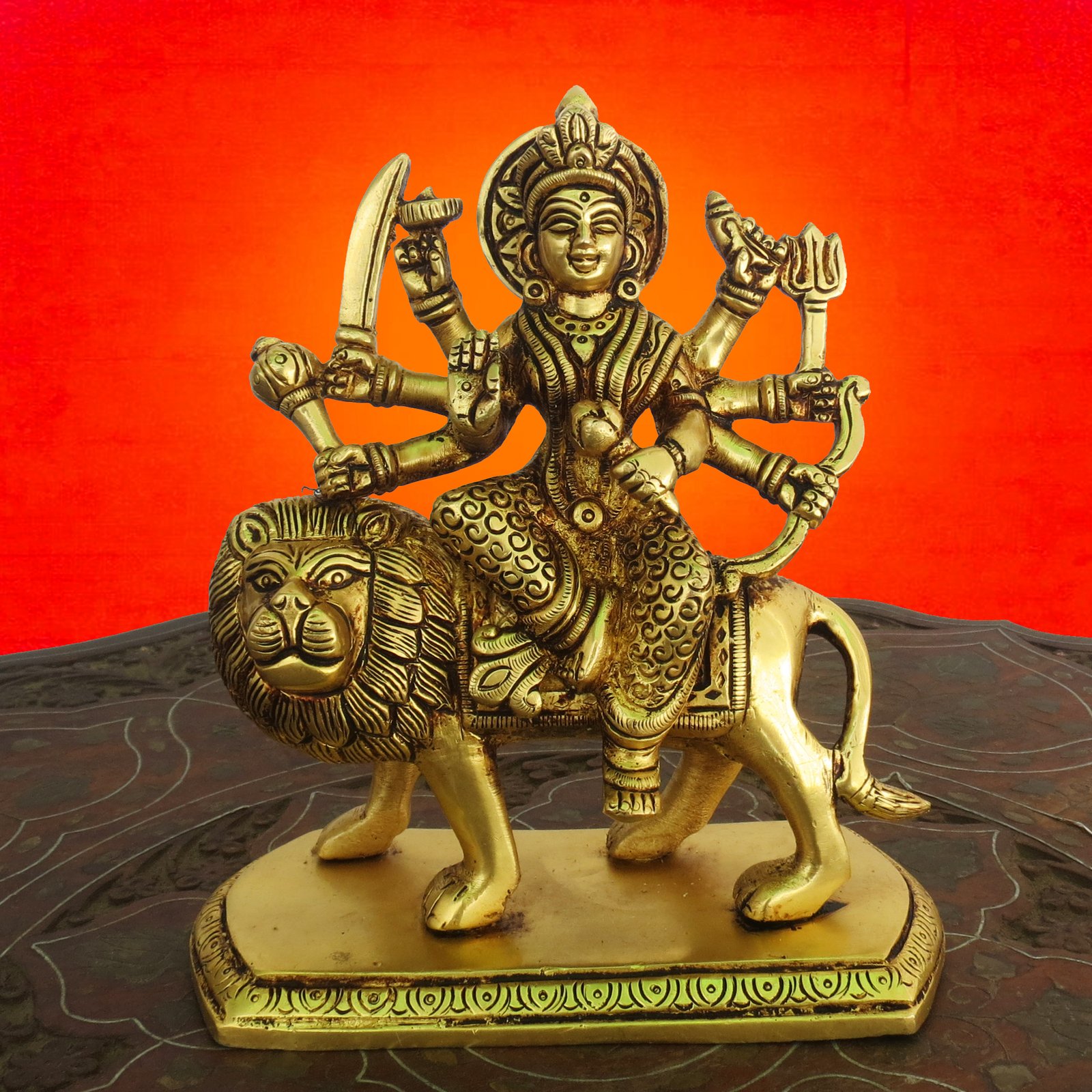 - Made of good quality brass, this Yellow-coloured Ambe Maa statue is Designing and beautifully shaped. Sturdy, easy to maintain, and long-lasting, this Ambe Maa makes a great addition to Pooja Temple.