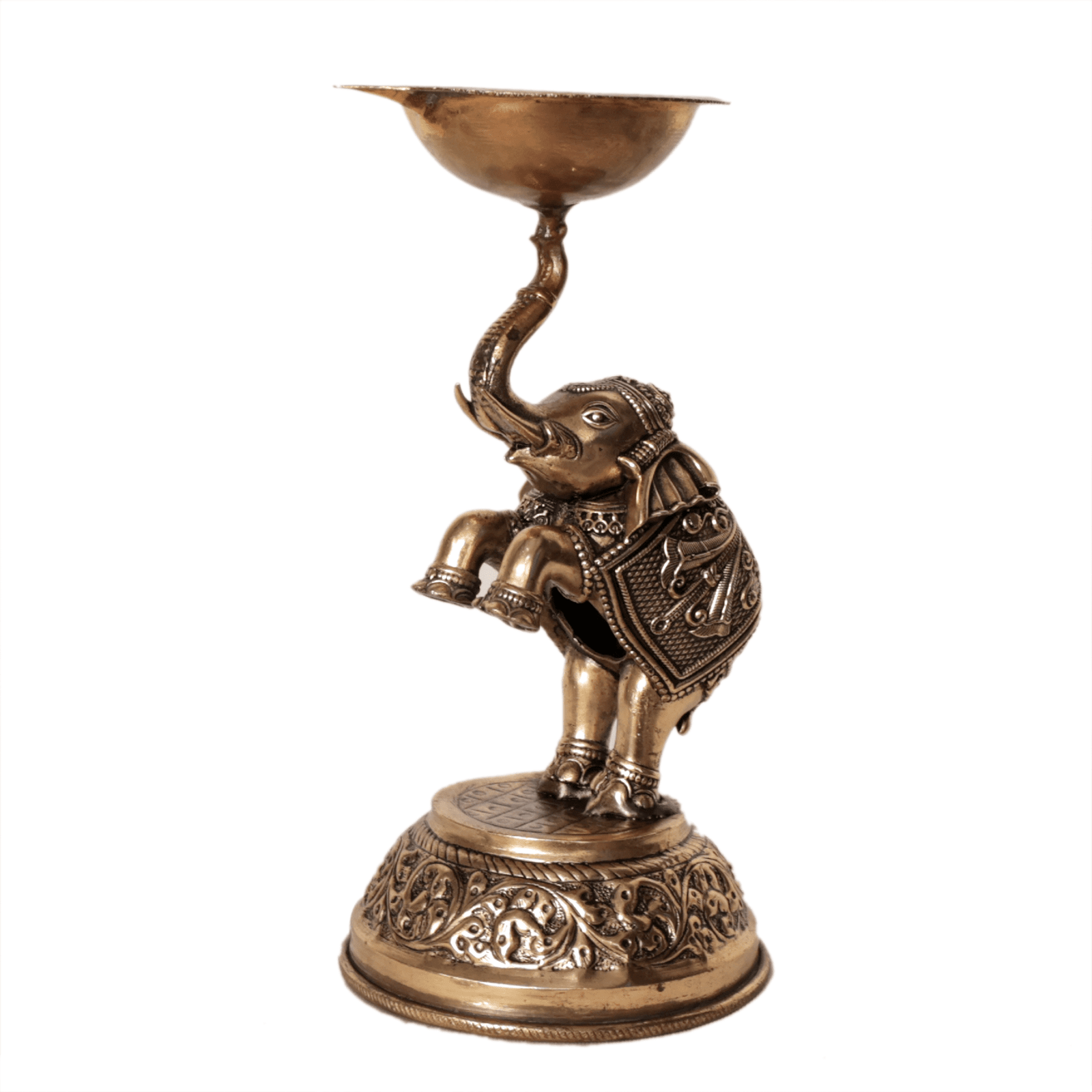 Crafted from premium-quality solid brass, this elephant diya reflects authentic Indian craftsmanship and a timeless antique finish. The elephant symbolizes royalty and stability, while the diya bowl is carefully designed to hold oil or ghee, ensuring a steady and bright flame during worship and rituals.