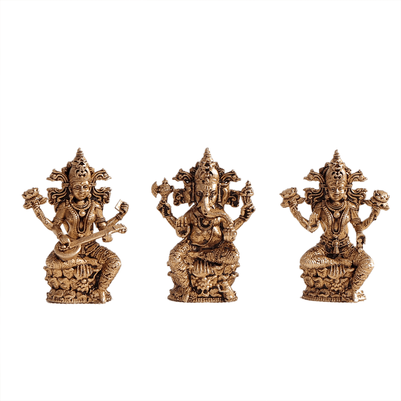 Presenting an elegant gift set featuring three sacred deities – Lord Ganesha, Goddess Lakshmi, and Goddess Saraswati – beautifully crafted in brass and presented in a luxurious red velvet box. This thoughtfully designed set combines spiritual significance with sophisticated presentation, making it an ideal corporate gift, festive present, or special occasion token that conveys blessings of wisdom, wealth, and prosperity.