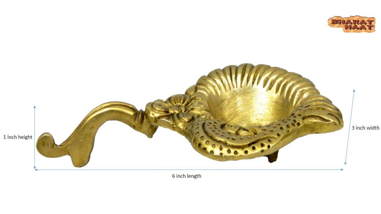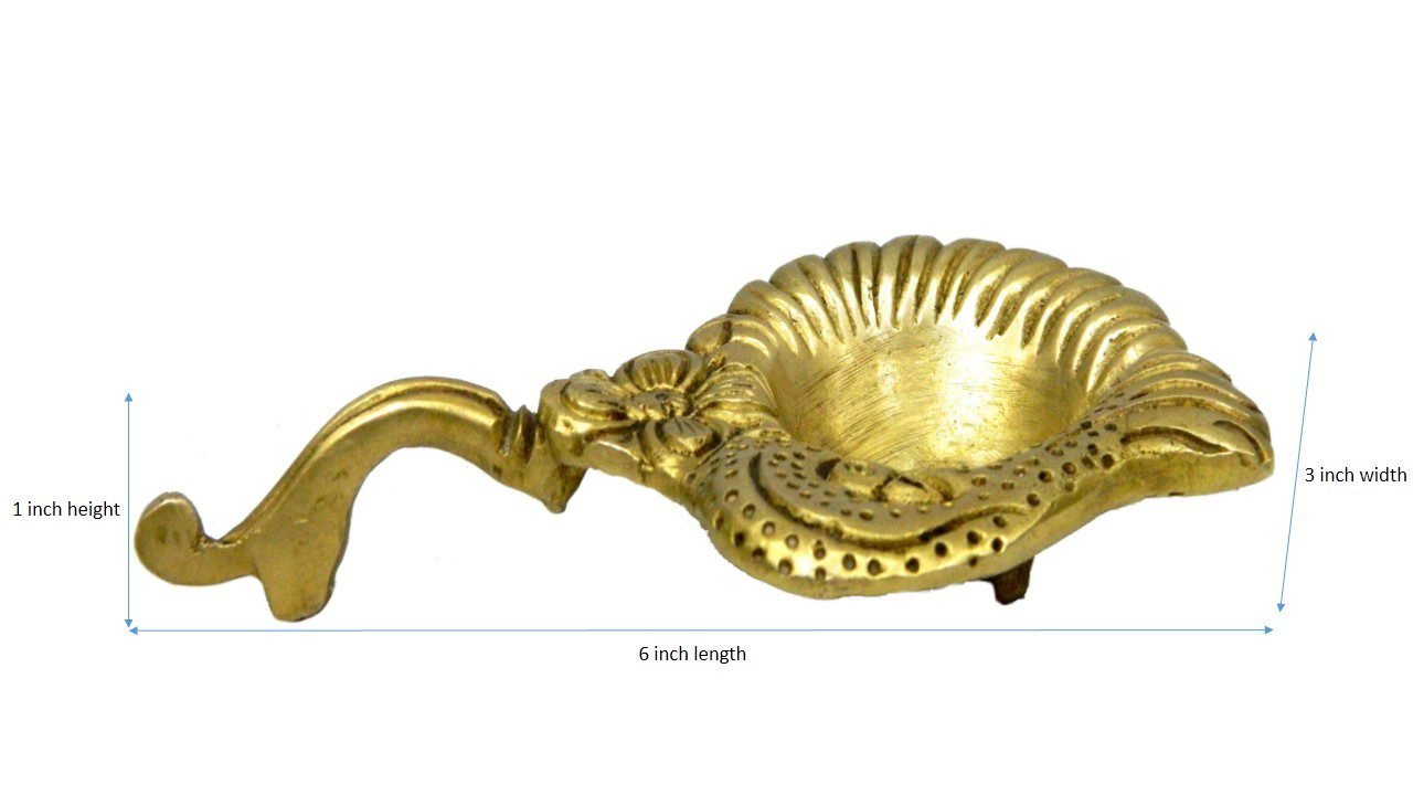 - Handheld Convenience: With a convenient 6 x 3 x 1 inch (15.24 x 7.62 x 2.54 cm) dimension and 340-gram weight, this brass diya is lightweight and easy to hold. The handle provides a comfortable grip, making it perfect for walking around during pooja and rituals.