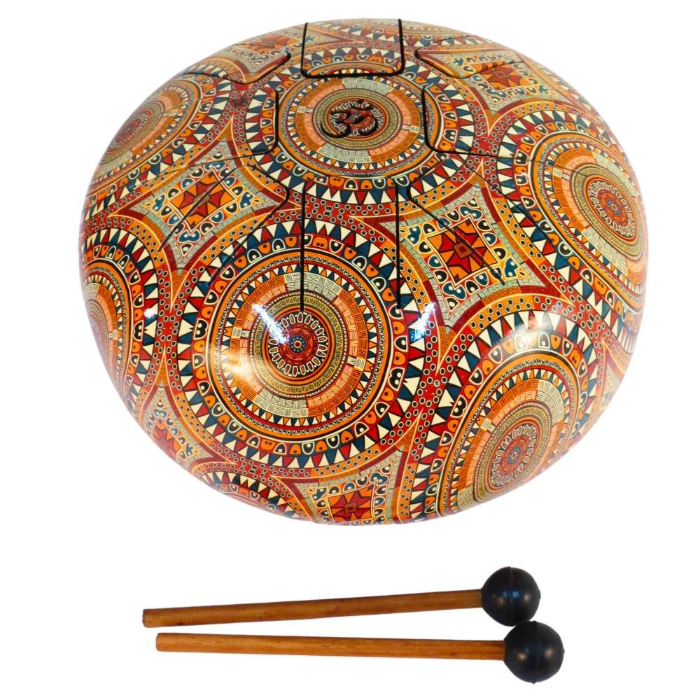 Keywords: brass patterned handpan drum, printed brass steel drum, decorative tongue drum, brass engraved meditation drum, musical instrument, relaxation, sound therapy.