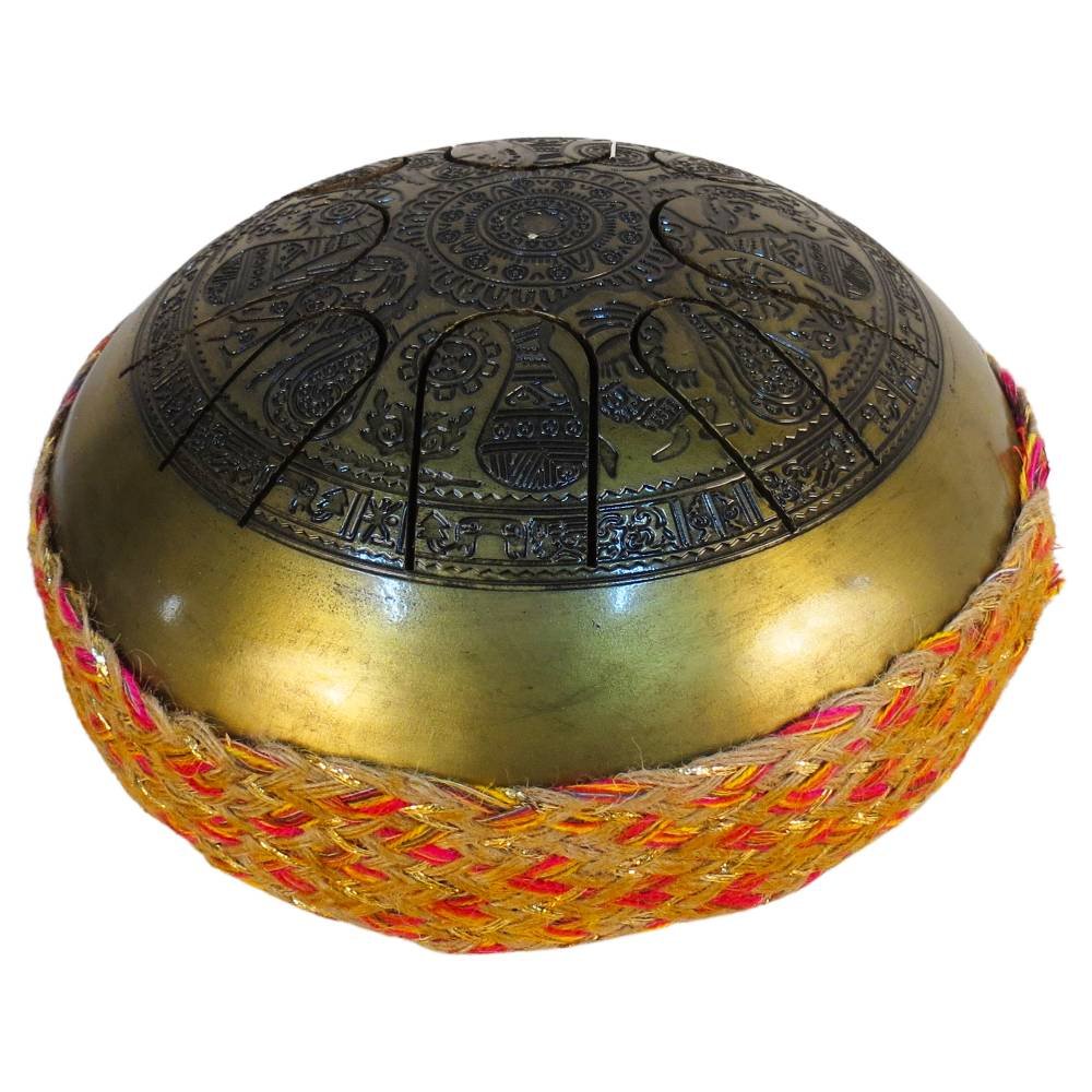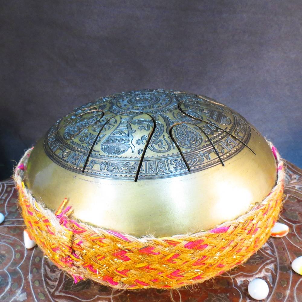 Add a touch of artistry and serenity to your home with this beautifully carved brass handpan drum.