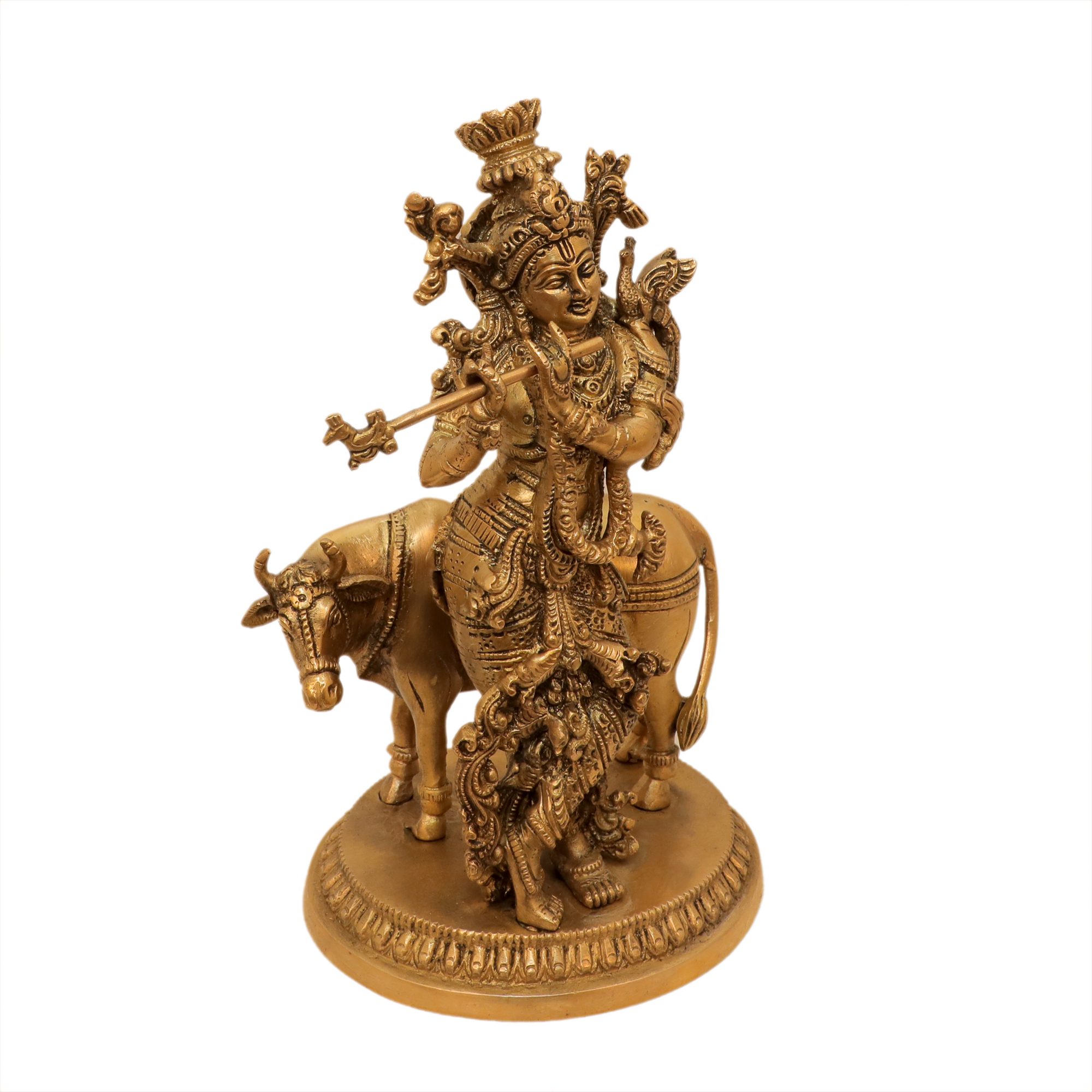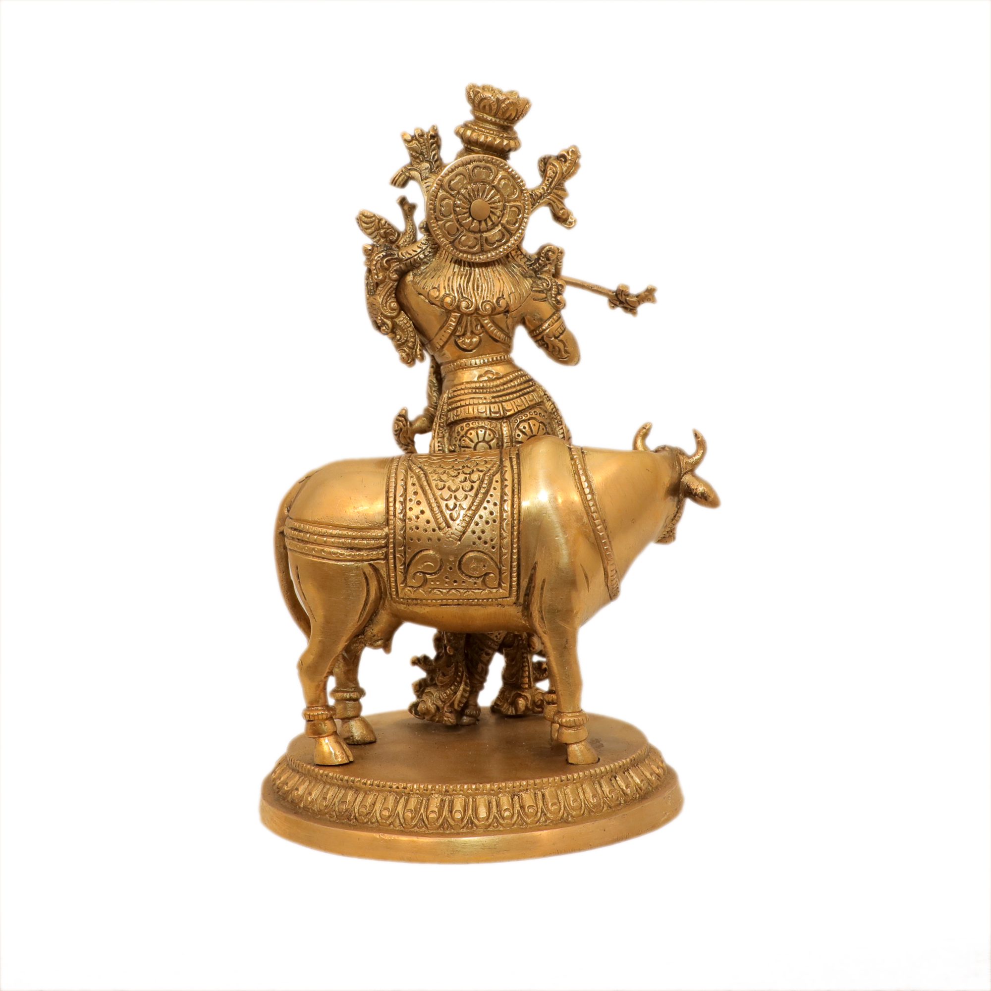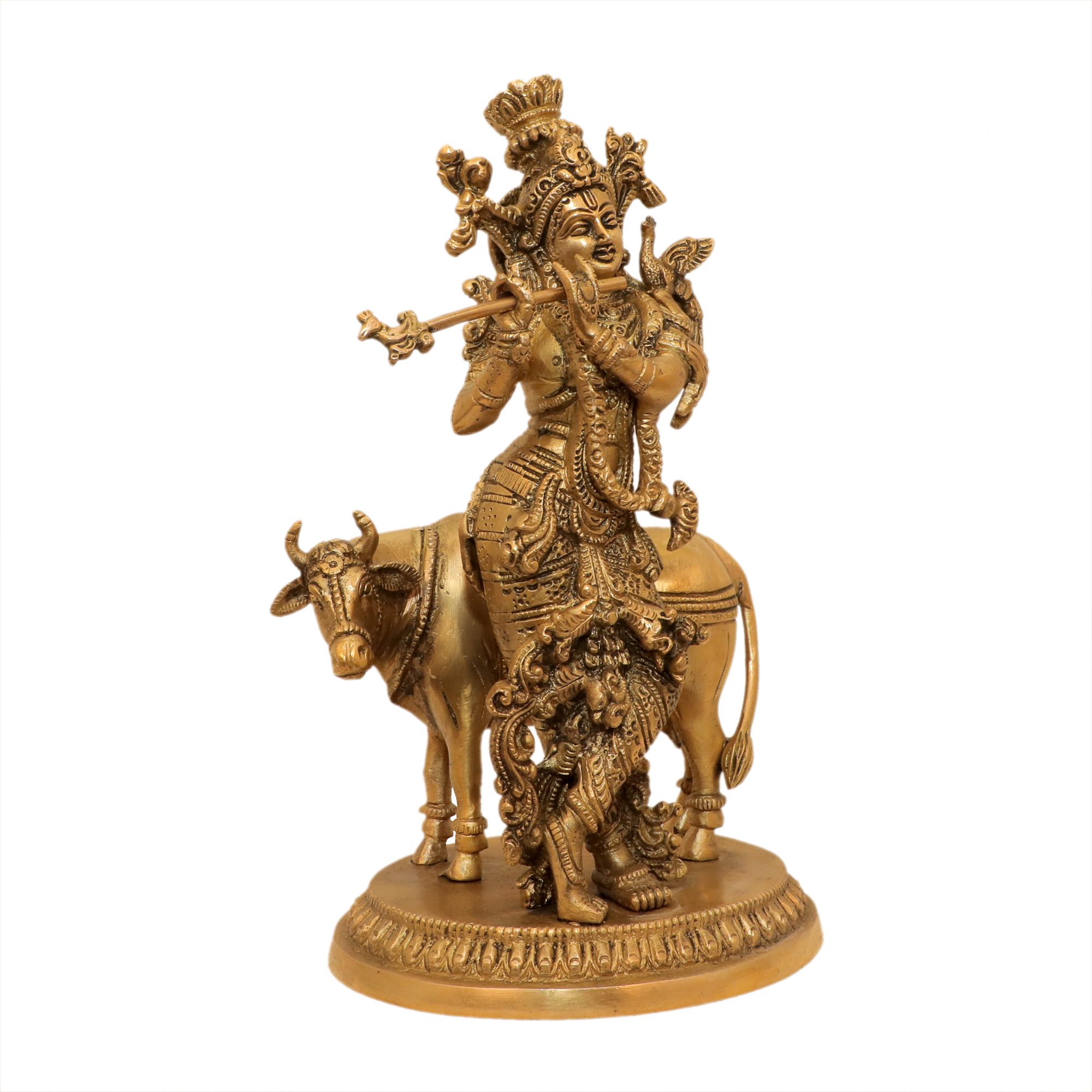 Brass Hindu God Figurine Krishna with Cow Statue 10 Inch