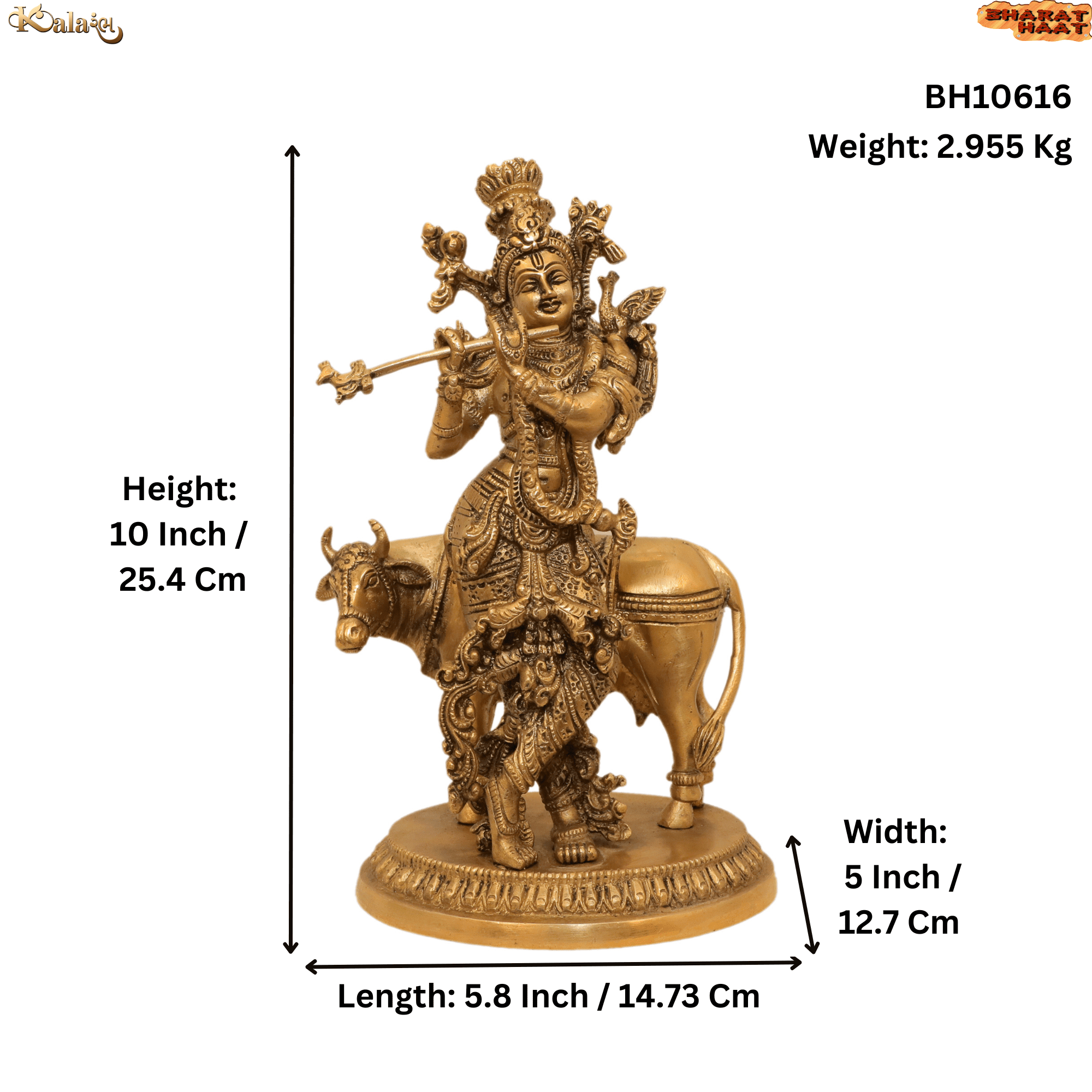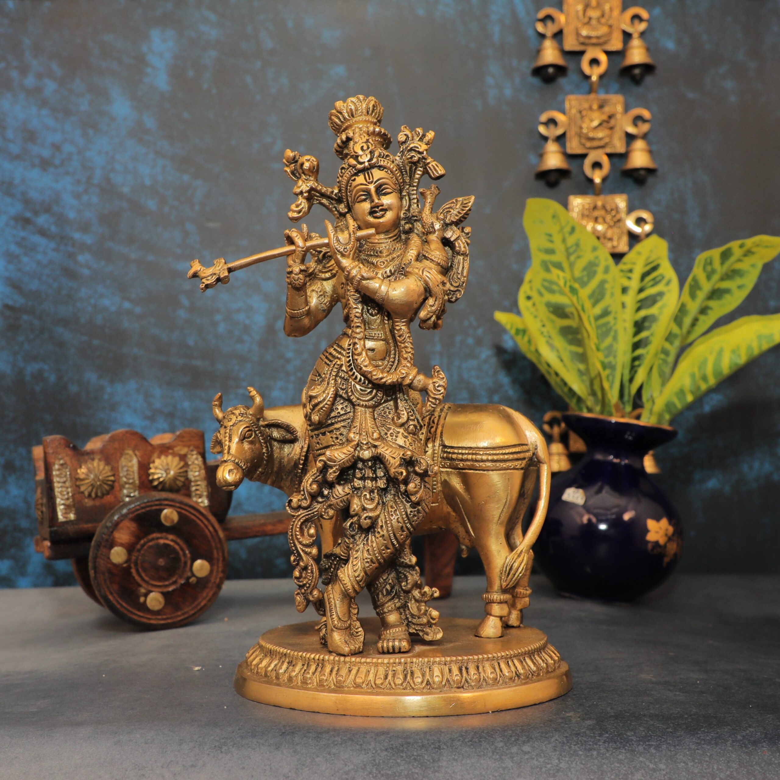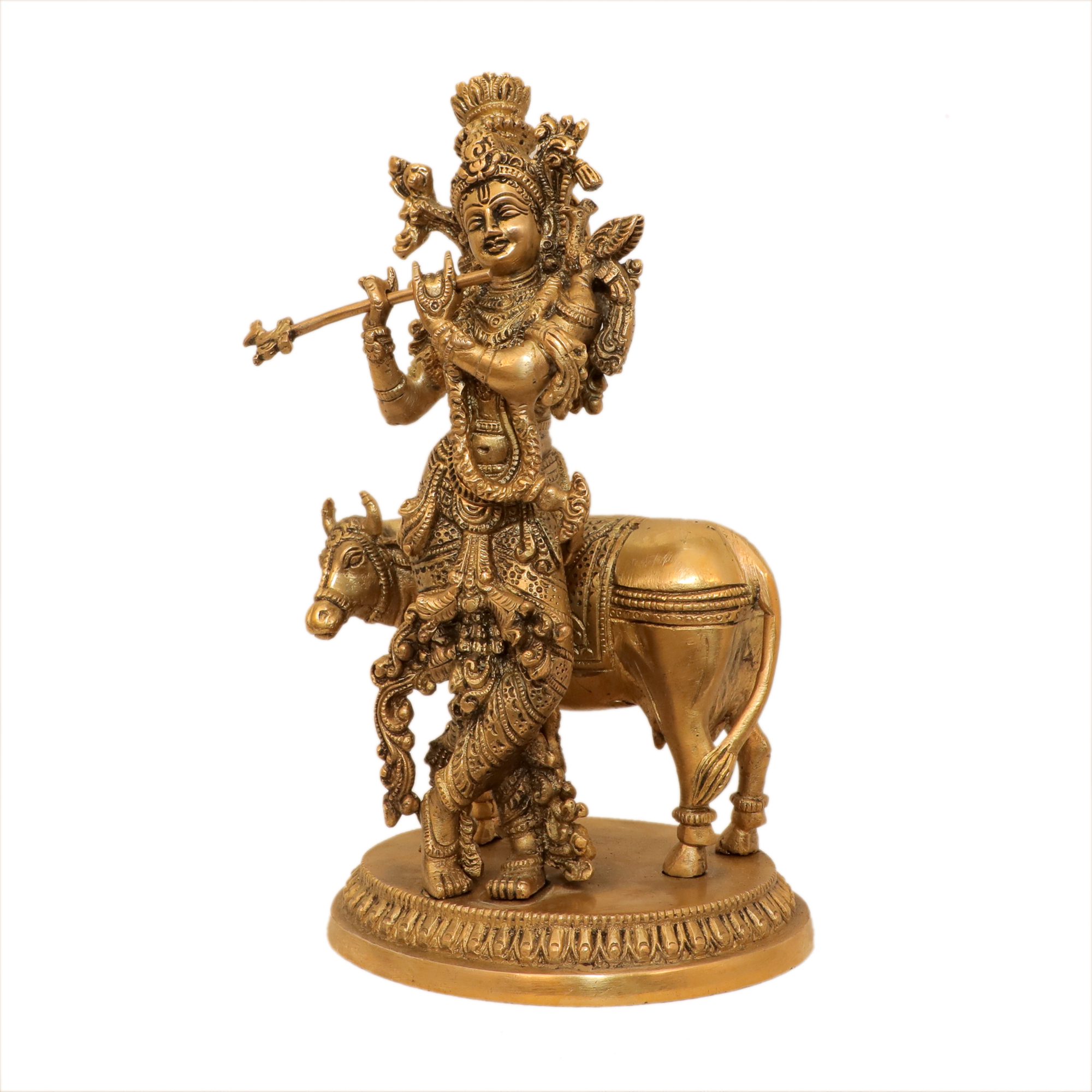 Brass Hindu God Figurine Krishna with Cow Statue 10 Inch