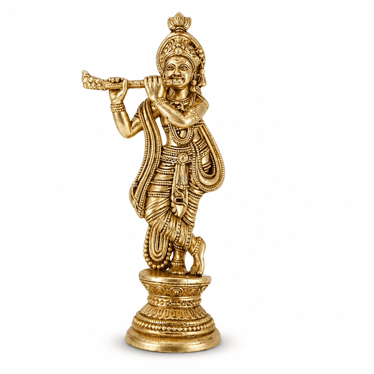 Its sturdy base ensures stability, while the polished surface gives it a rich and elegant look. Easy to maintain, simply wipe with a soft cloth to retain its shine. This handcrafted brass Krishna idol is a blend of tradition, culture, and modern elegance.