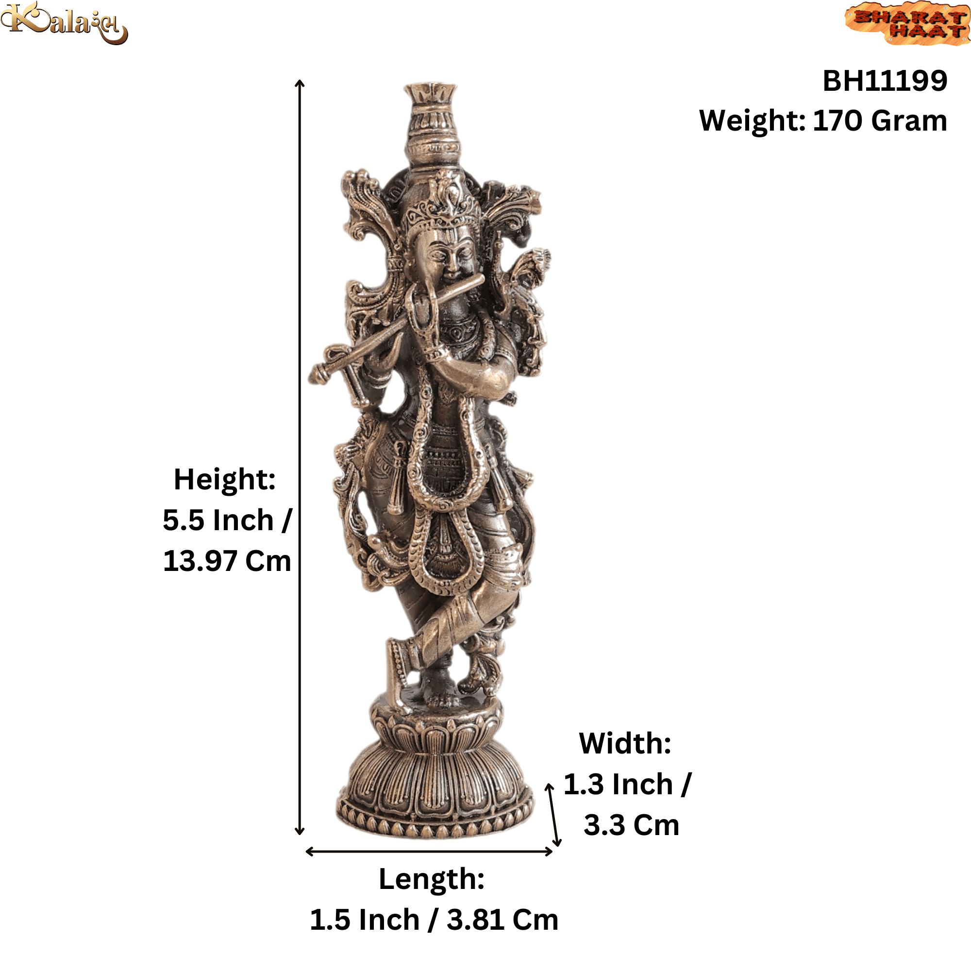 Grace your space with divine serenity through this elegantly crafted Brass Krishna idol. Standing at 5.5 inches tall, this statue portrays Lord Krishna in his iconic posture, playing the flute, symbolizing love, compassion, and spiritual harmony. Made from high-quality solid brass, it features fine detailing and a smooth antique finish that reflects skilled craftsmanship.
