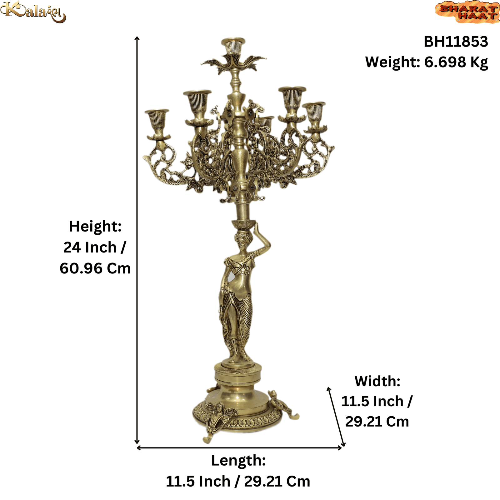 Made from premium-quality brass, the candle stand showcases intricate detailing, smooth finishes, and a timeless antique look. With dimensions of 11.5 x 11.5 x 24 Inch (29.21 x 29.21 x 60.96 cm), it serves as a striking centerpiece, adding height and elegance to your décor. The solid 6.698 Kg weight ensures stability and long-lasting quality.