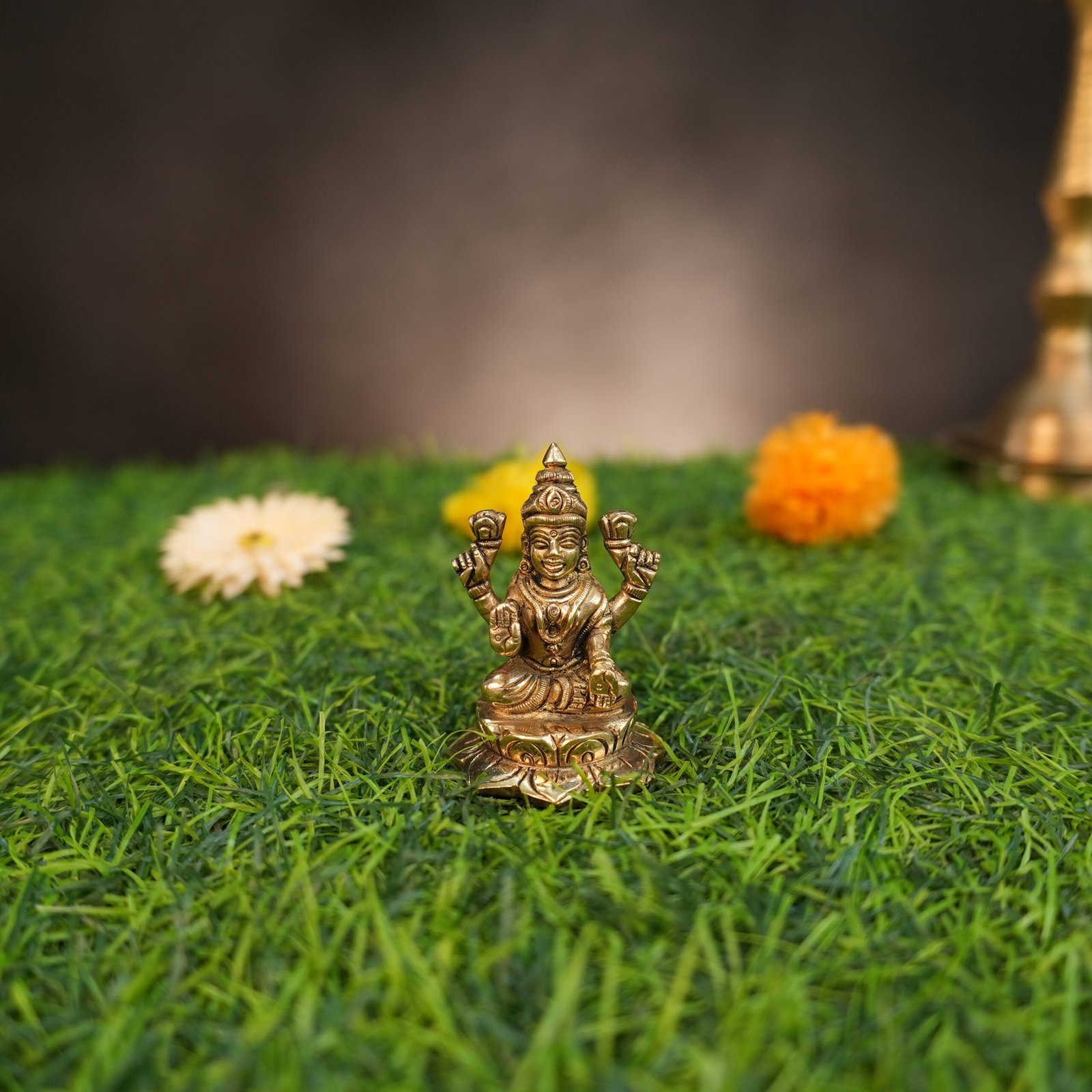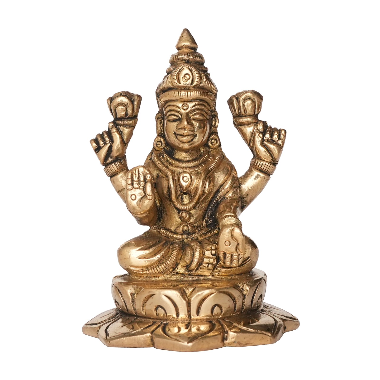 Embrace the divine blessings of Goddess Lakshmi with our exquisite Brass Lakshmi Statue, gracefully seated on a blooming lotus pedestal!