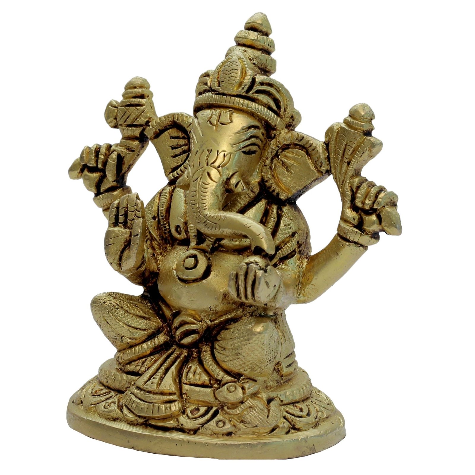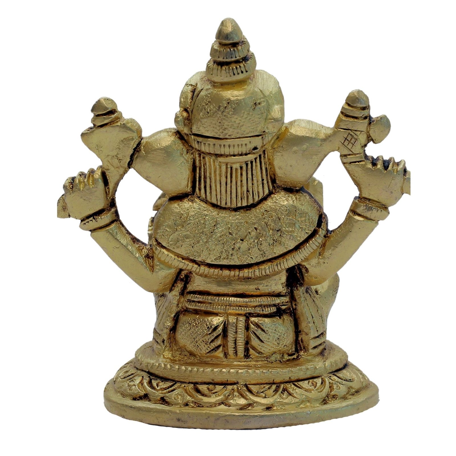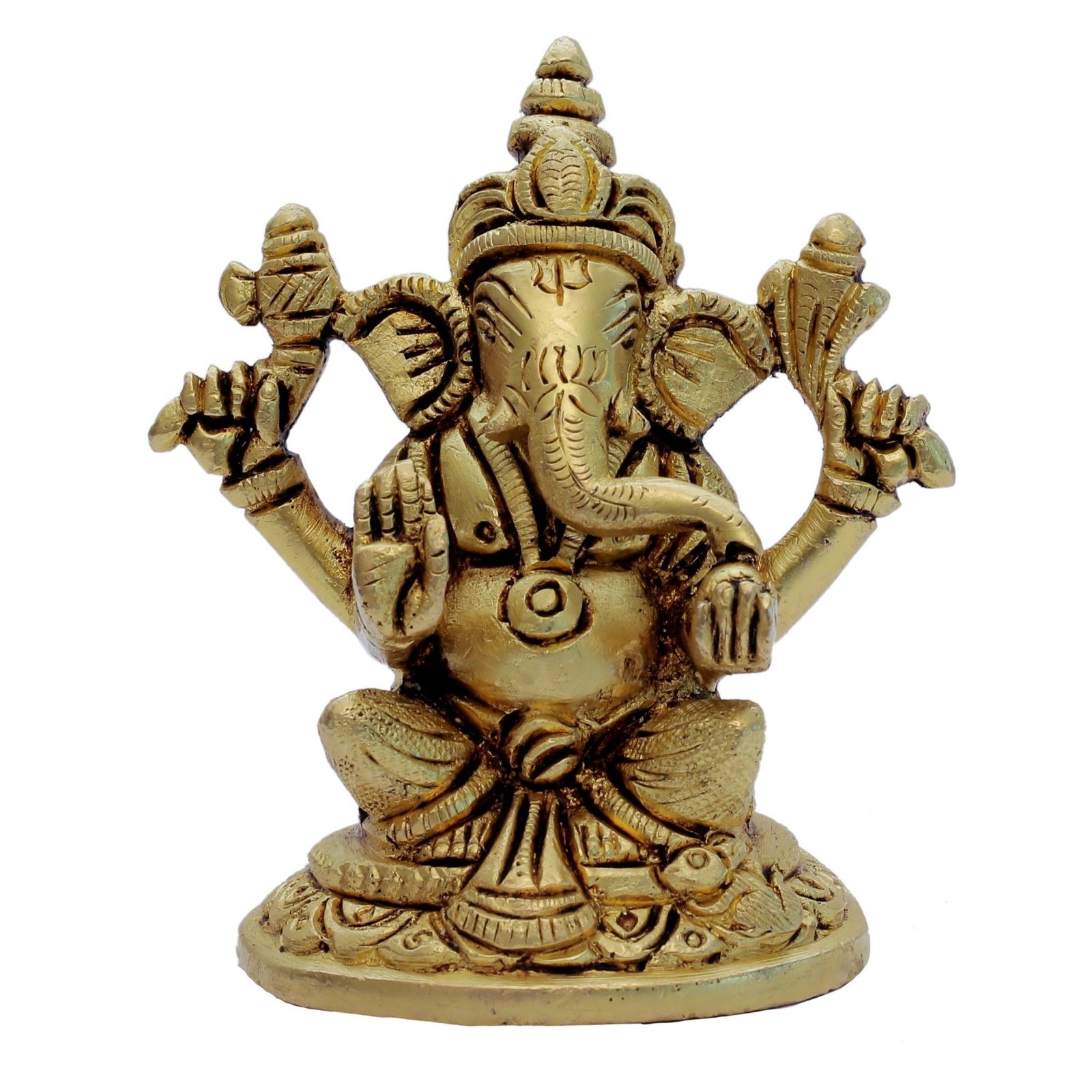 ✔ A Beautiful Small Ganesh Four Hands art Work Sitting on Flower Design Round Base in Brass Metal. Place it in your living room and get praised for your exclusive choice. A great gift idea for house warmings and festivals.