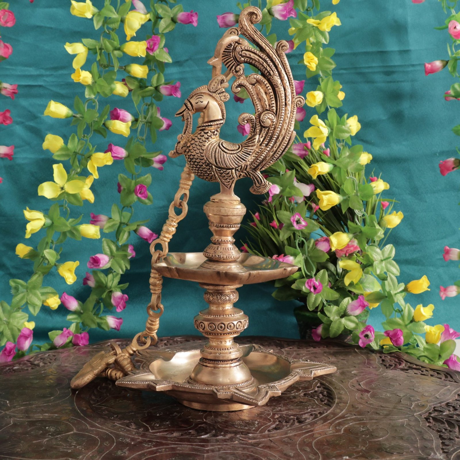 Brass Peacock Hanging Diya | Traditional Hanging Brass Oil Lamp for Temple, Home Mandir & Festive Decor