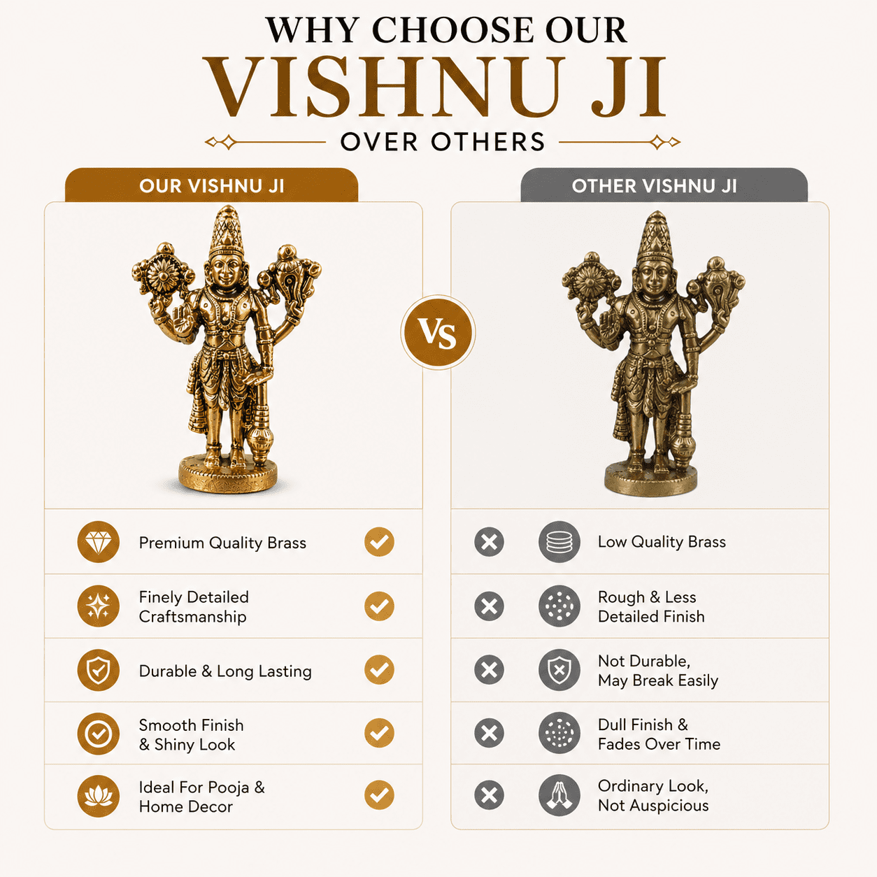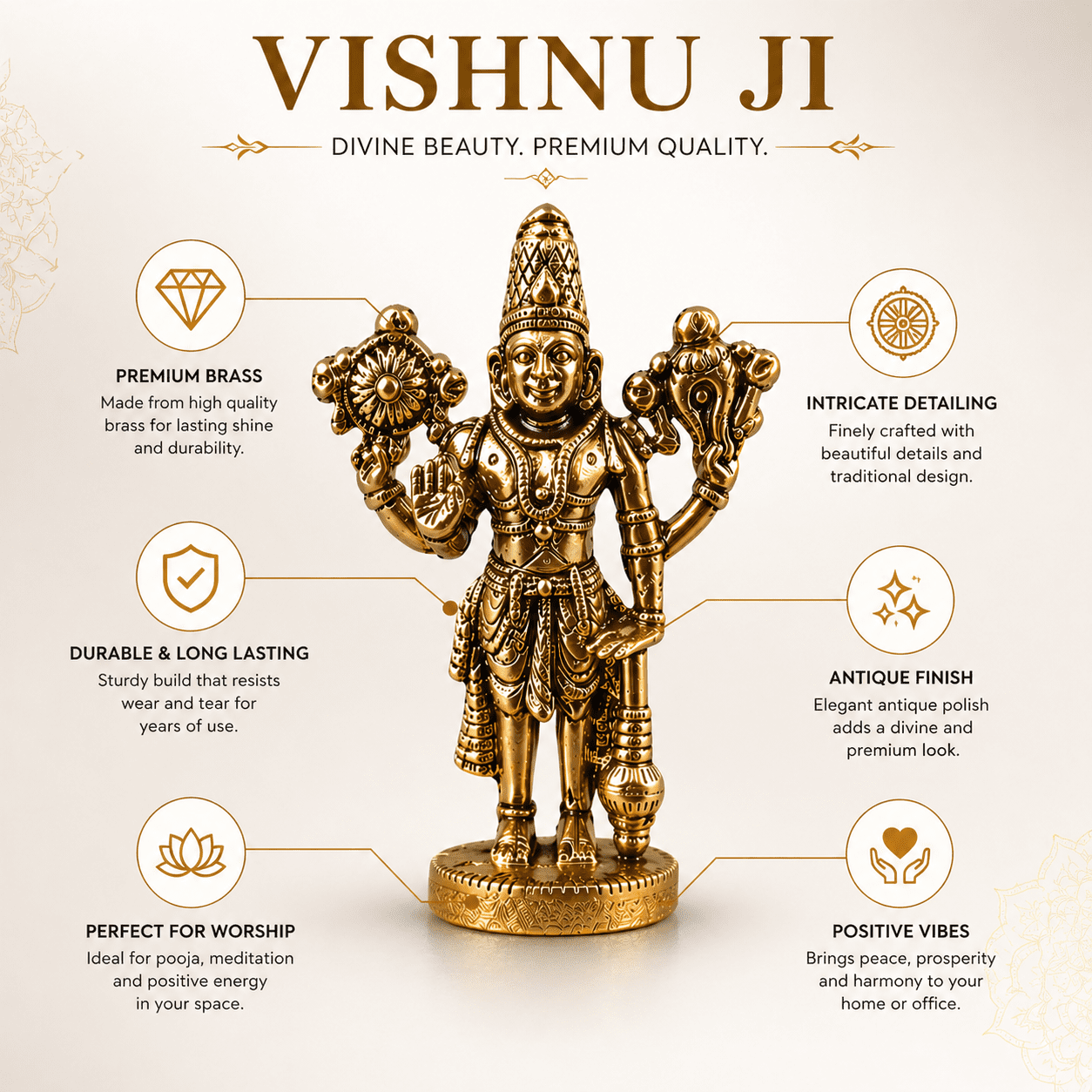 Whether you are looking for a Vishnu ji murti for pooja, a spiritual brass décor item, or a premium religious gift, this Brass Vishnu Ji Idol is a perfect blend of tradition, beauty, and positivity. Add divine blessings and timeless charm to your surroundings with this stunning brass idol.