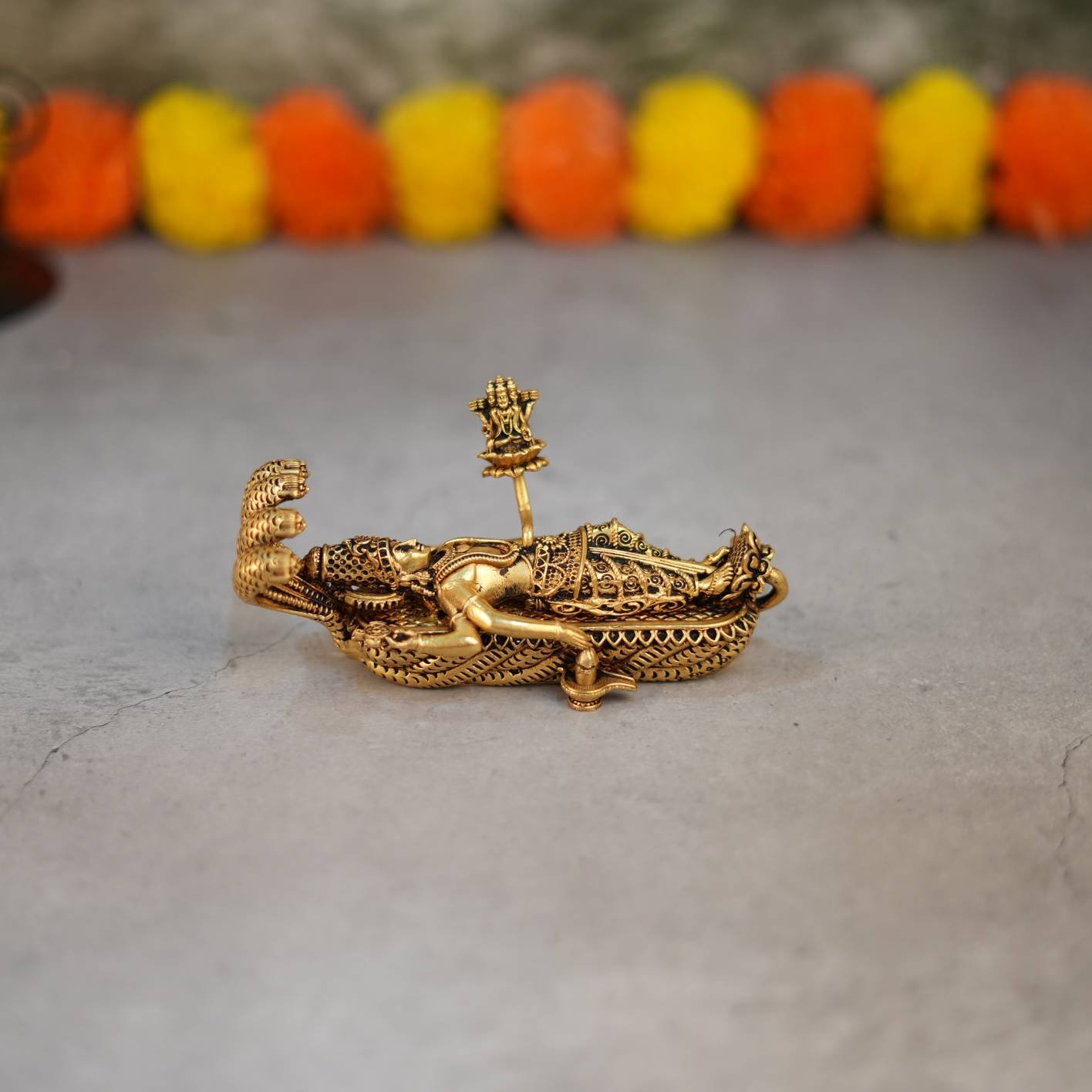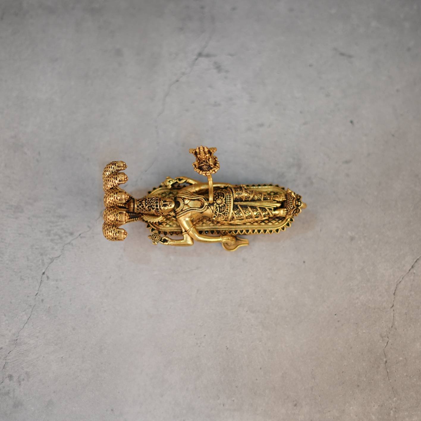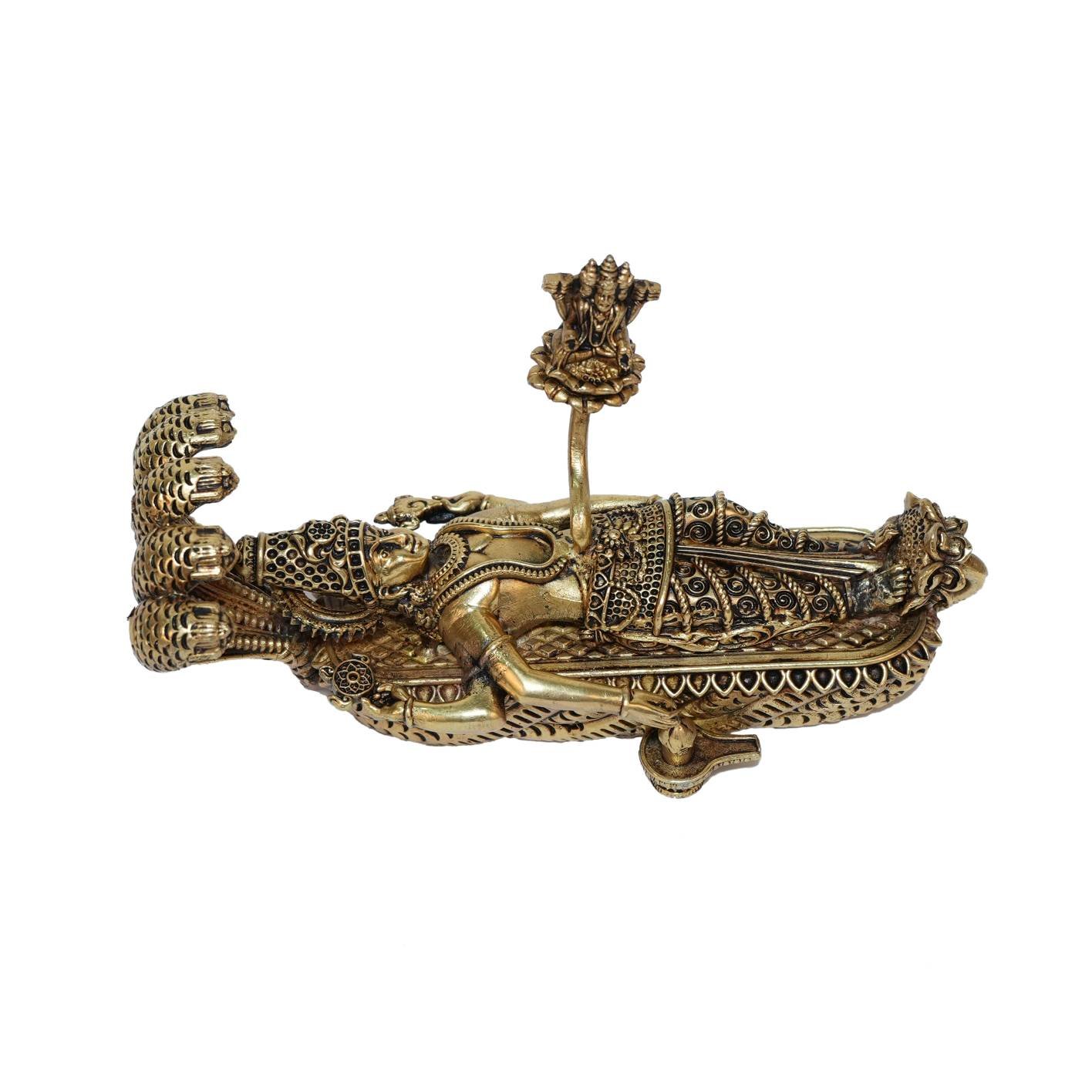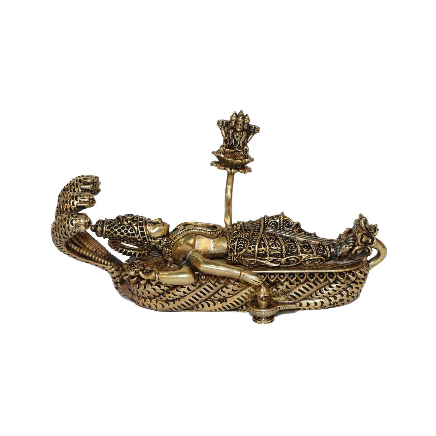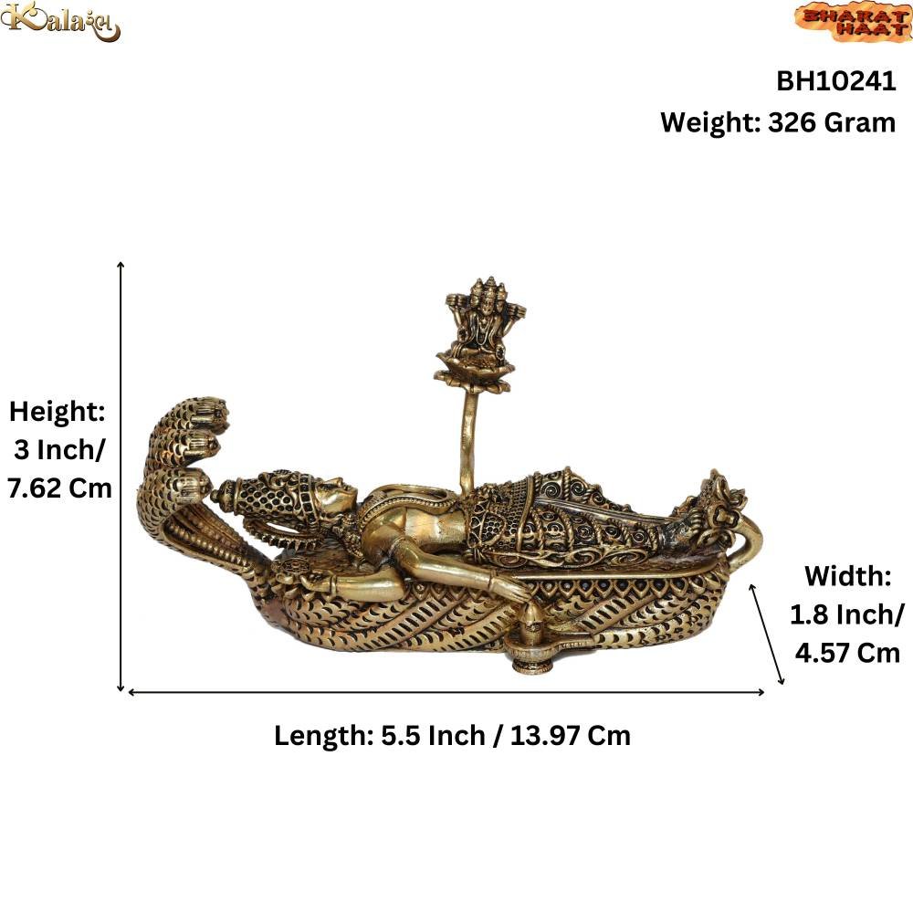 Crafted from high-quality brass, this Vishnu idol depicts the Lord reclining on the mighty serpent Sheshnag, symbolizing infinite time and eternal power. The detailed artistry captures the serene expression of Lord Vishnu and the majestic form of Sheshnag, making this piece a true work of spiritual art.