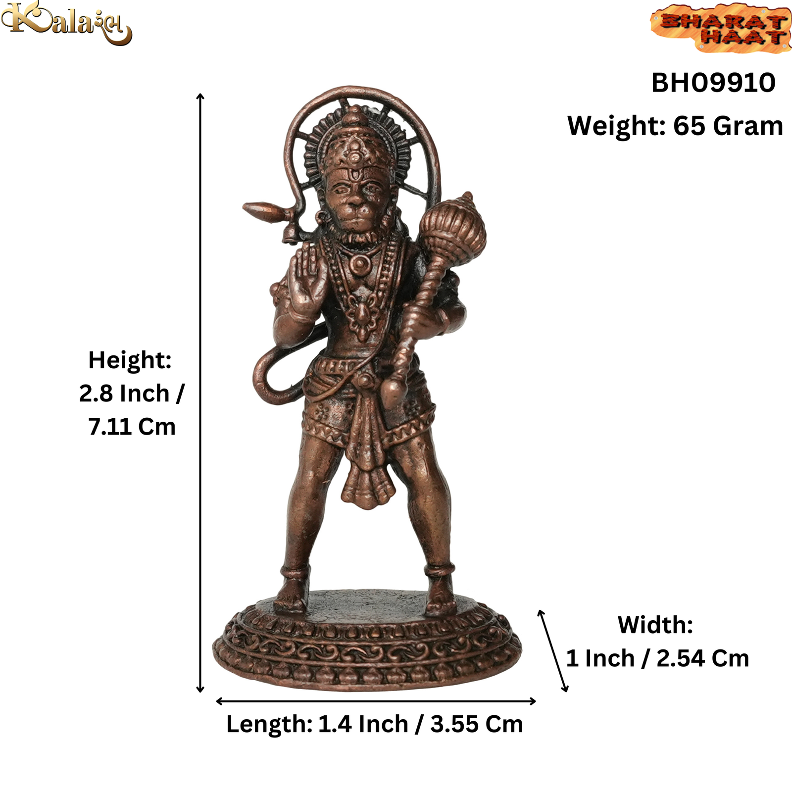 Crafted with intricate detail and reverence, this enchanting Copper Hanuman Sculpture depicts the mighty Lord Hanuman in a standing pose, exuding power and grace. Measuring 1.4 x 1 x 2.8 inches (or 3.55 x 2.54 x 7.11 cm) and weighing 65 grams, it emanates elegance and spiritual significance.