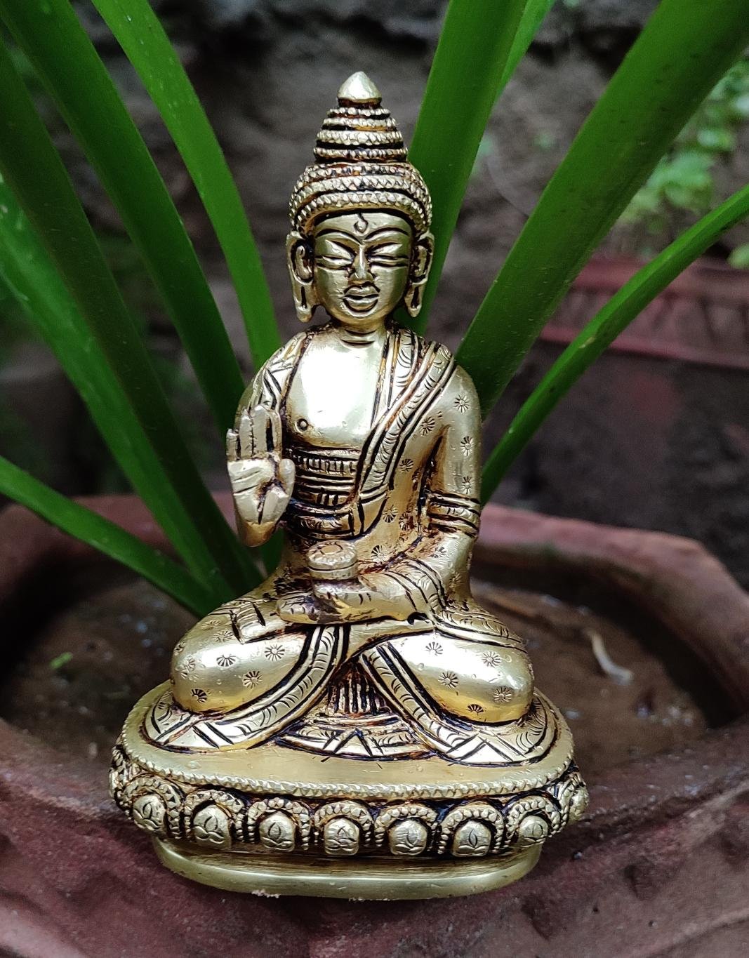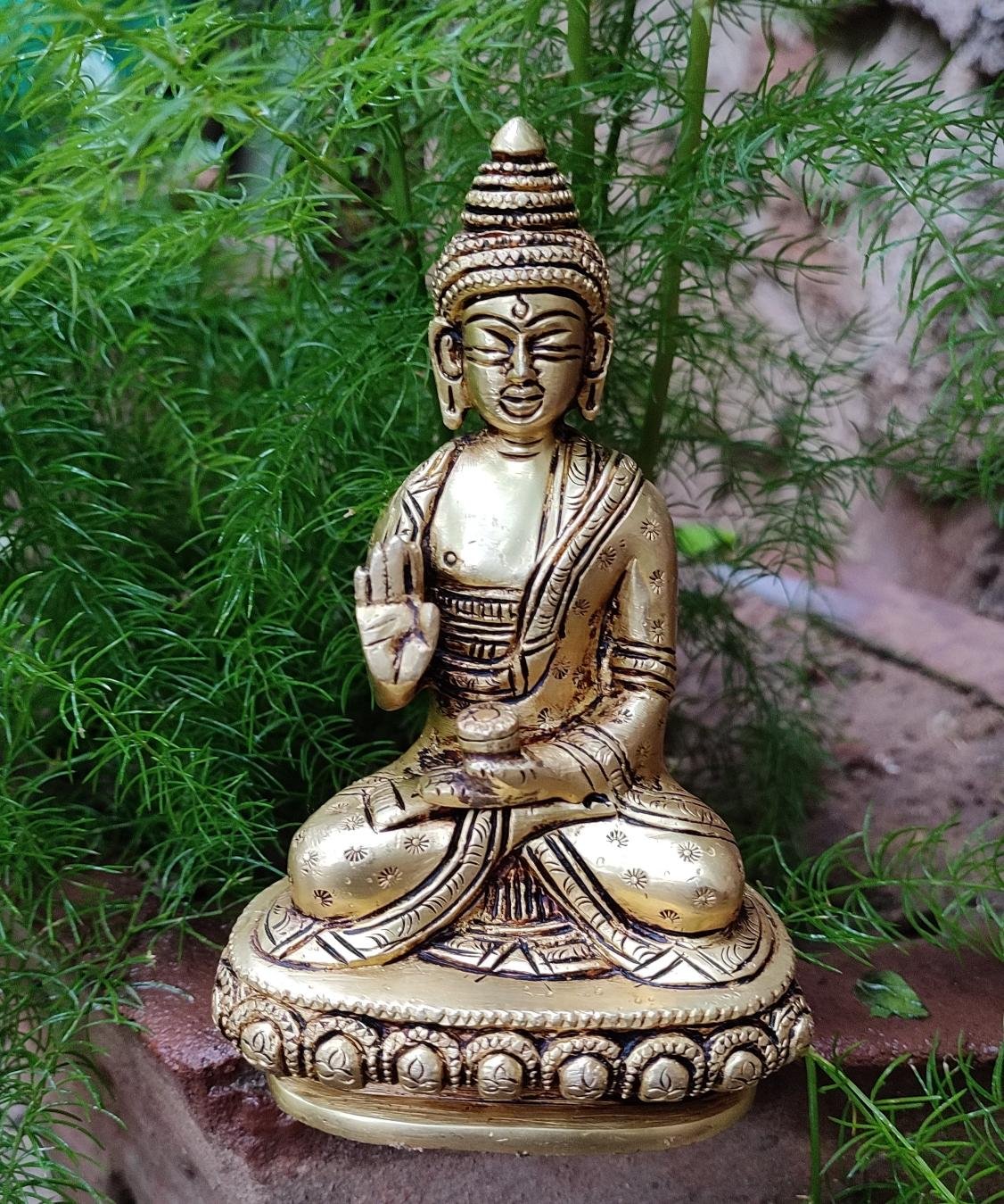 This brass Buddha statue features a serene and meditative representation of Lord Buddha, symbolizing peace, mindfulness, and spiritual awakening. The handcrafted detailing, along with the calming posture, makes it a perfect centerpiece for home altars, meditation spaces, or as a decorative piece that radiates tranquility. The solid brass construction ensures durability and long-lasting beauty, while its compact size makes it versatile for various settings.