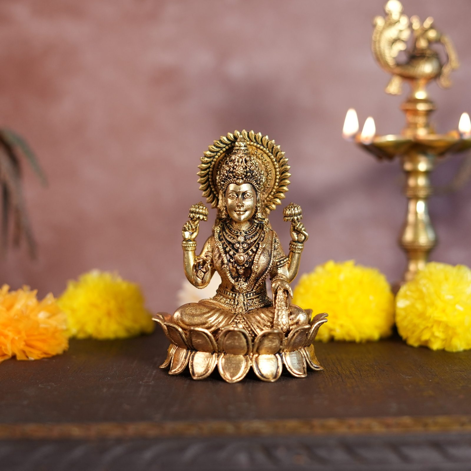 Product Description: Enhance your space with the blessings and grace of Goddess Laxmi, the deity of wealth and prosperity, through this beautifully crafted brass idol. Handmade by artisans from Kalarambh using traditional sand casting techniques, this Laxmi idol features intricate detailing and a golden brass finish that adds elegance to any setting. Whether placed in your home, office, or a sacred space, this idol symbolizes good fortune and spiritual harmony.