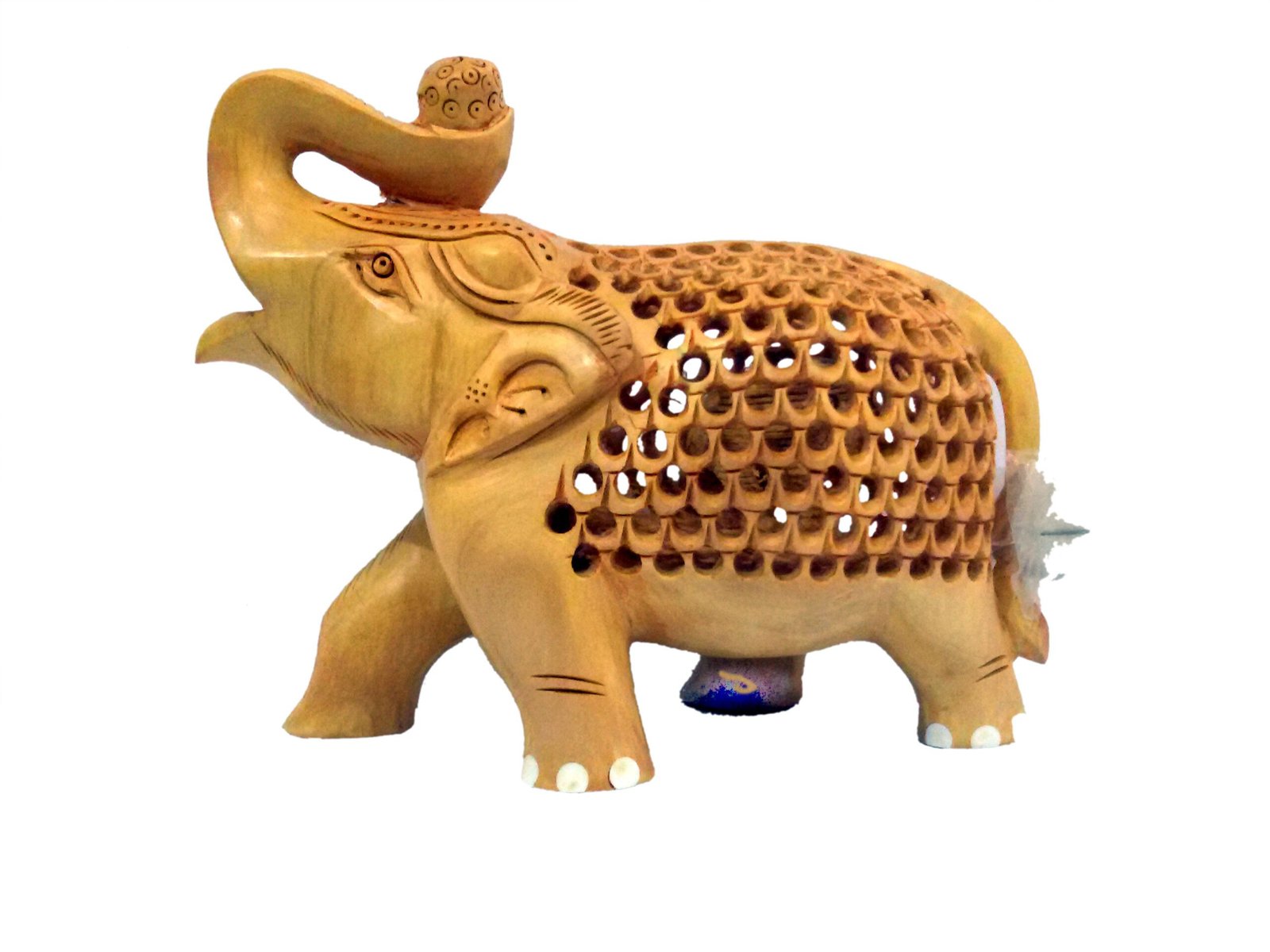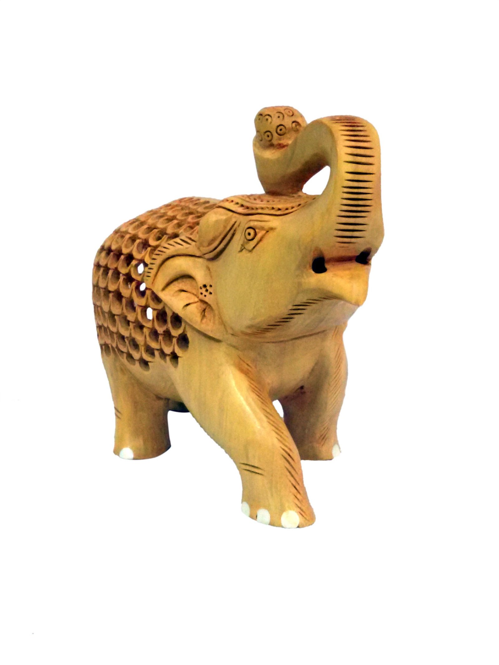 Carved from high-quality wood, this elephant features delicate Jali work, a technique that involves creating intricate lattice patterns, adding a sense of sophistication and detail to the sculpture. The elephant, a symbol of wisdom, strength, and good fortune, is beautifully rendered with attention to detail, making it a standout piece for any home or office decor.