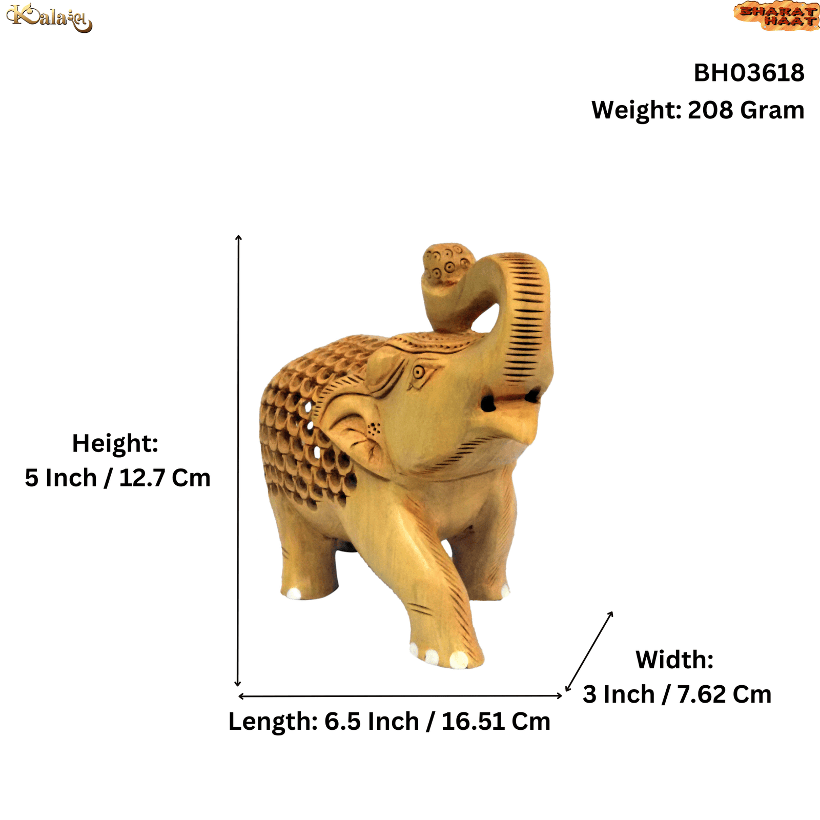 Enhance your decor with the elegance of traditional craftsmanship through this Handcrafted Wooden Salami Jali Work Elephant. Measuring 6.5 x 3 x 5 inches (16.51 x 7.62 x 12.7 cm) and weighing 208 grams, this intricately designed elephant figurine is a stunning example of the rich cultural artistry known as Jali work.