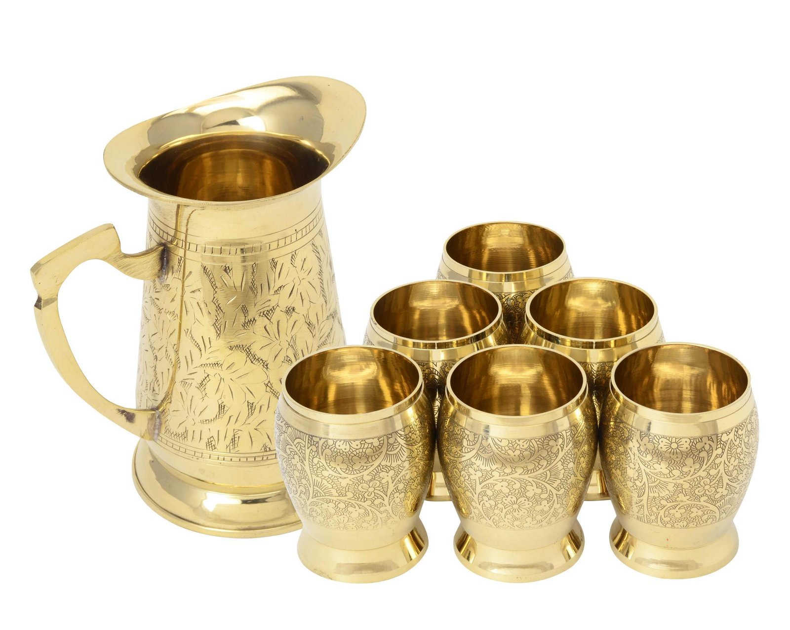 Home Essentials Brass Dining Decor Water Pot with Glass Set 3.8 Inch Height