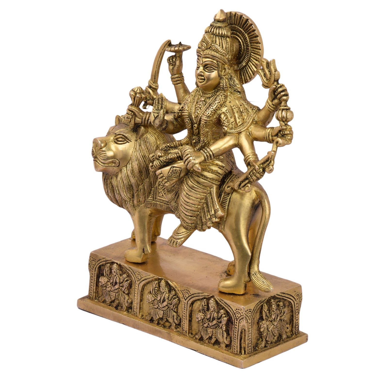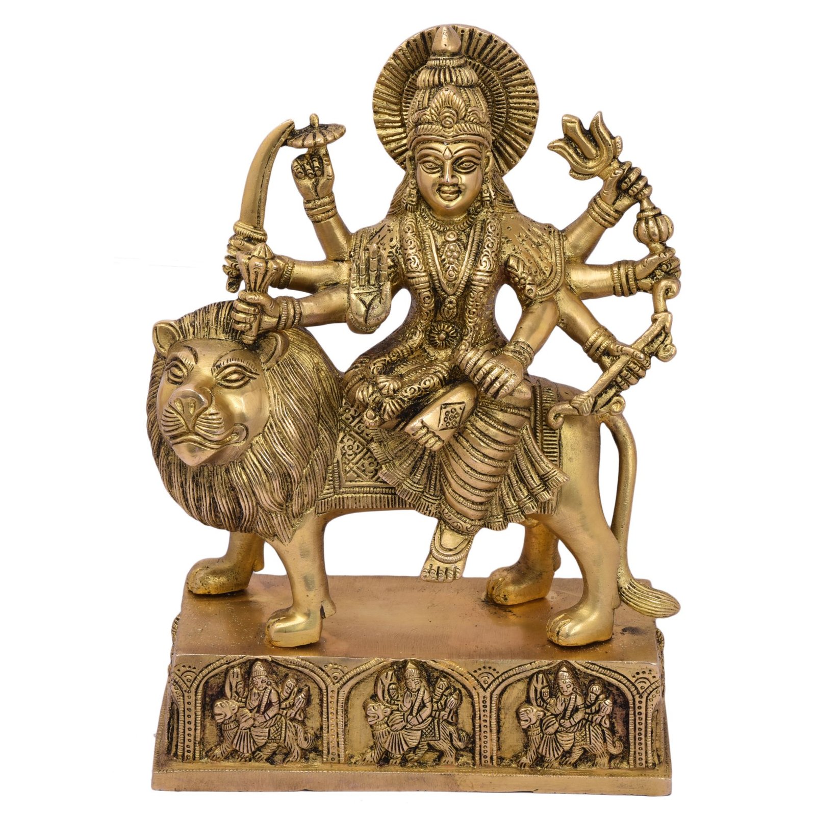 - Made of good quality brass, this Yellow-coloured Ambe Maa statue is Designing and beautifully shaped. Sturdy, easy to maintain, and long-lasting, this Ambe Maa makes a great addition to Pooja Temple.