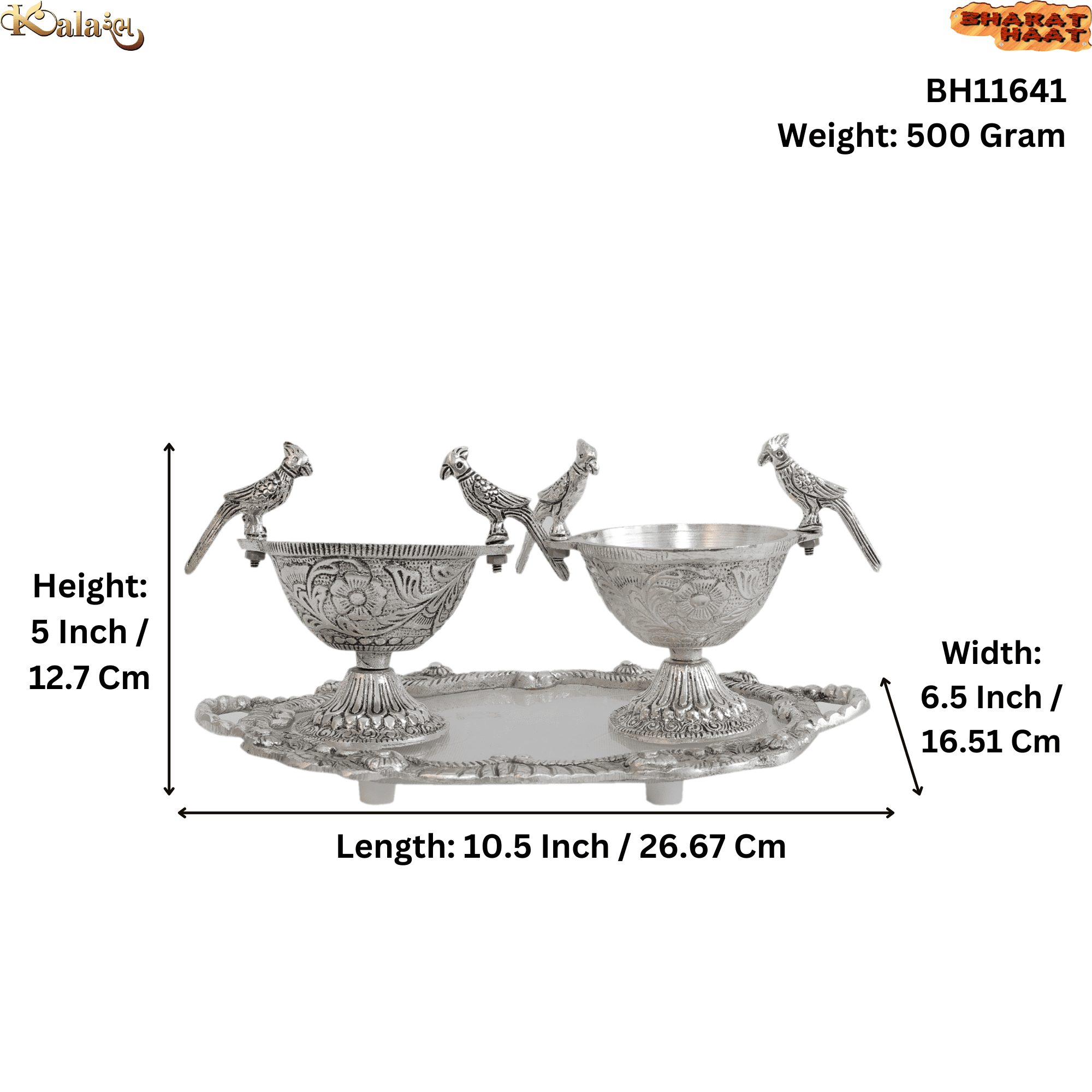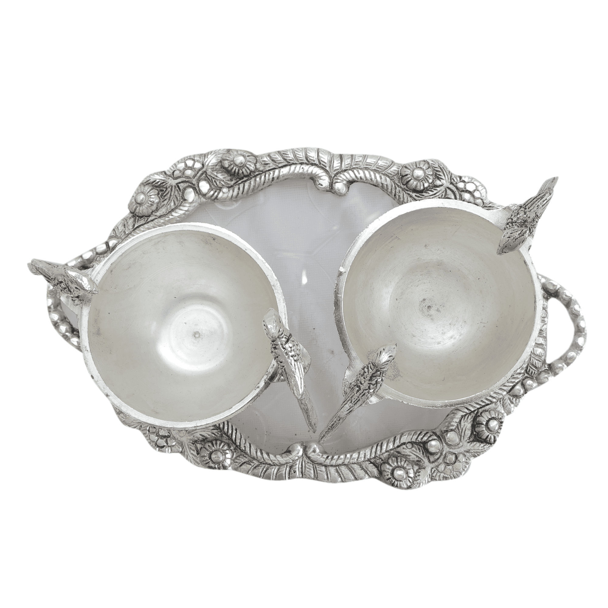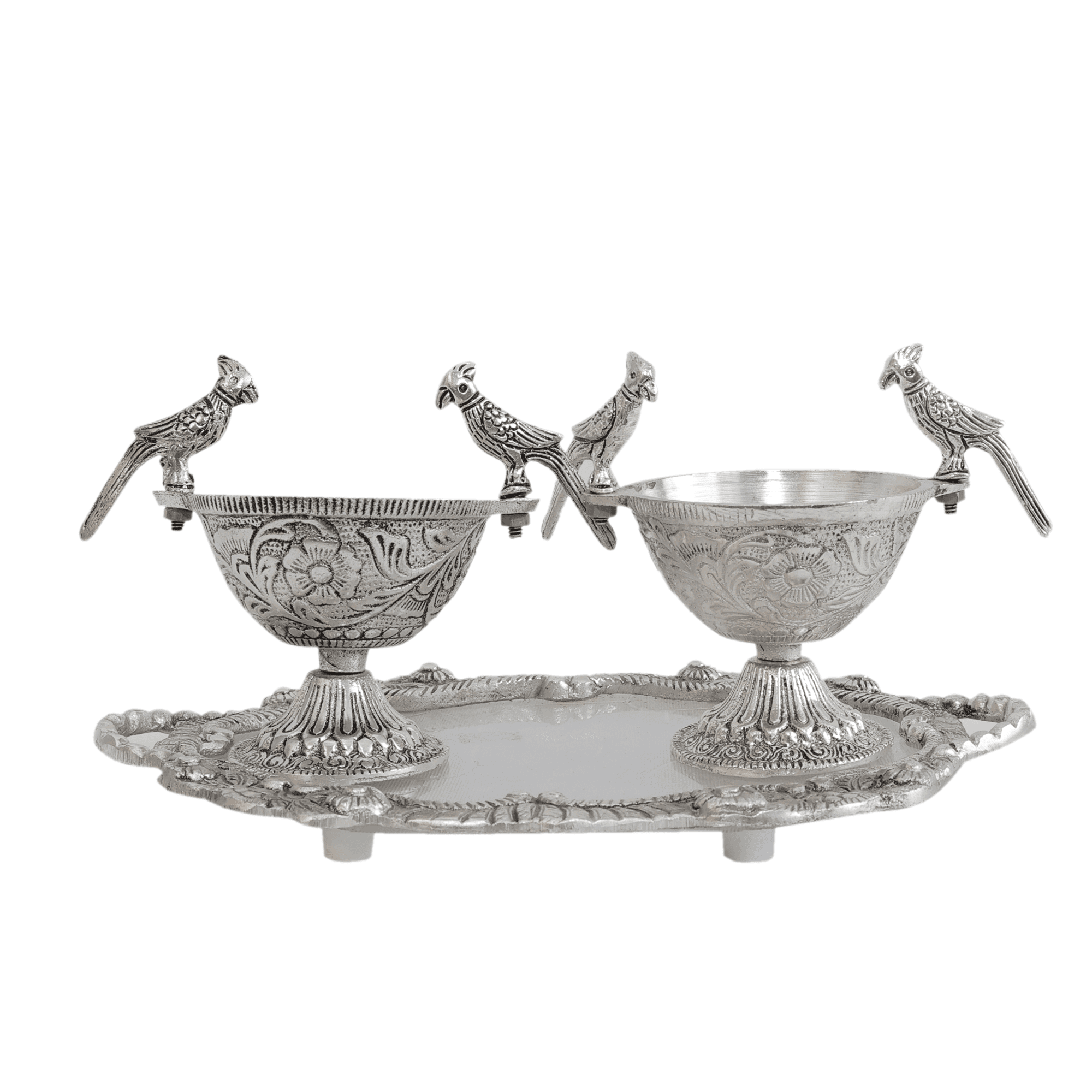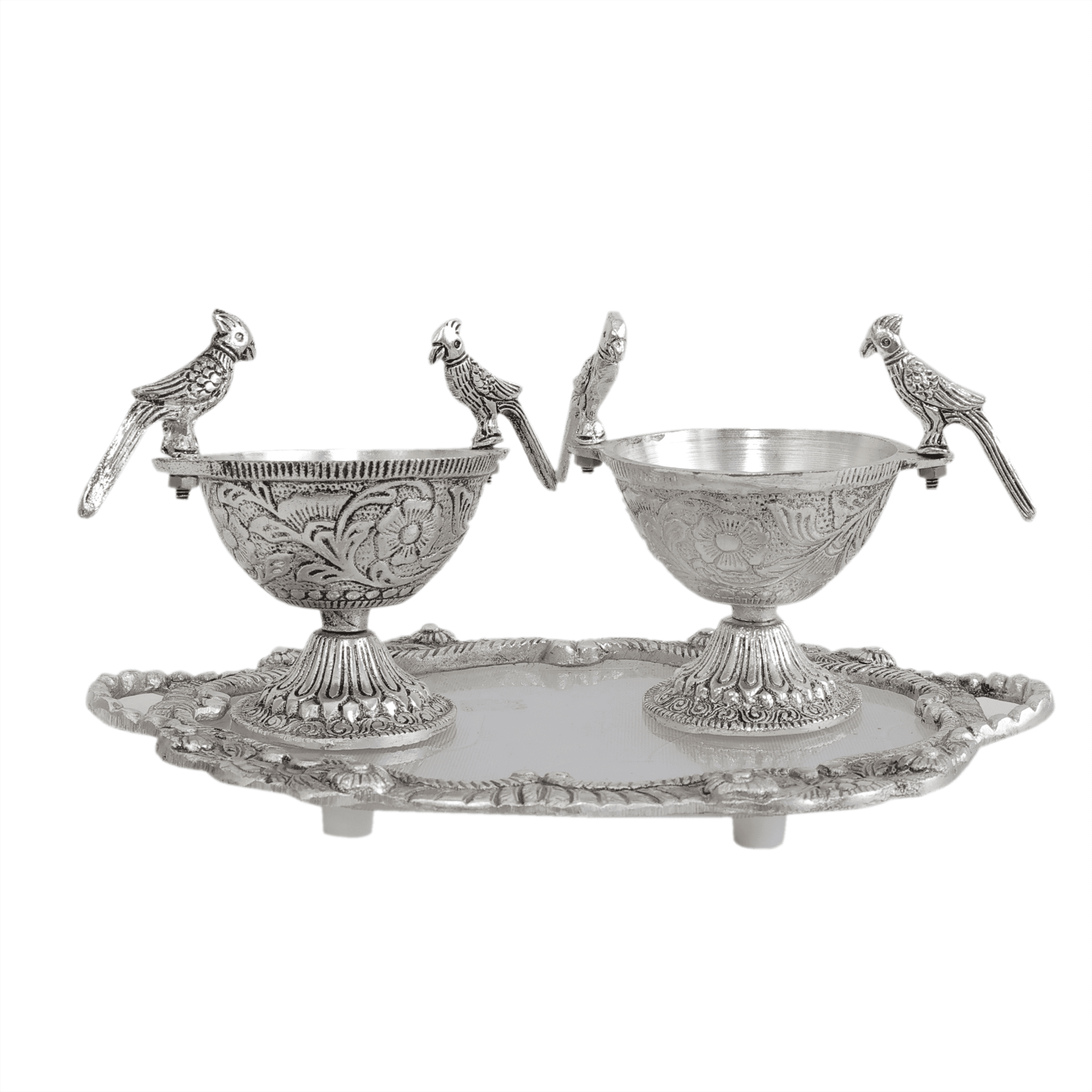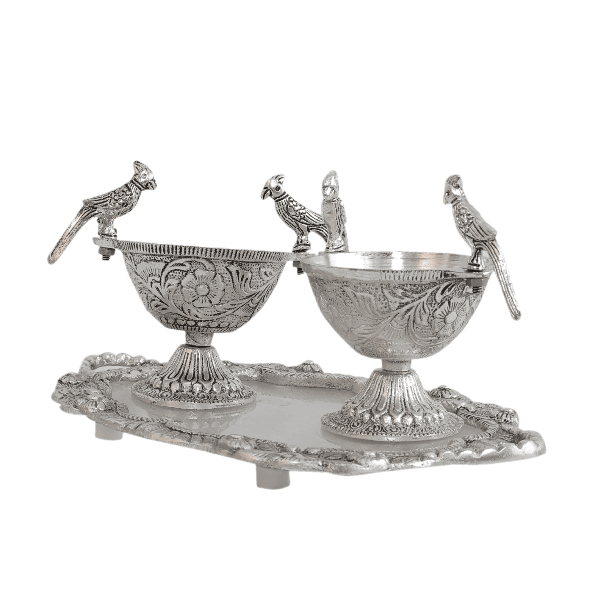 Bring home a perfect blend of elegance and tradition with this beautifully handcrafted Metal 2 Parrot Bowls & Tray Set. Made from premium quality metal, this decorative set features two intricately designed parrot-shaped bowls placed on an ornate matching tray, showcasing fine craftsmanship and artistic detailing.