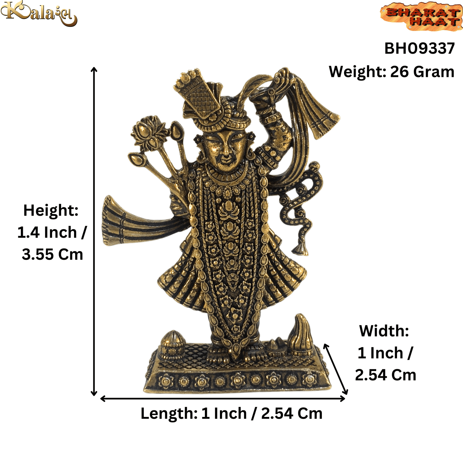 Introducing the exquisite Brass Shreenathji statue, a finely crafted representation of Lord Shreenathji, an incarnation of Lord Krishna. This beautifully detailed piece captures the divine essence of Shreenathji, showcasing his grace and serenity. Measuring 1 x 1 x 1.4 inches (2.54 x 2.54 x 3.55 cm) and weighing just 26 grams, this petite statue is perfect for any space, be it your home altar, desk, or as a travel companion. Despite its compact size, the intricate craftsmanship and high-quality brass construction make it a remarkable addition to your spiritual collection.