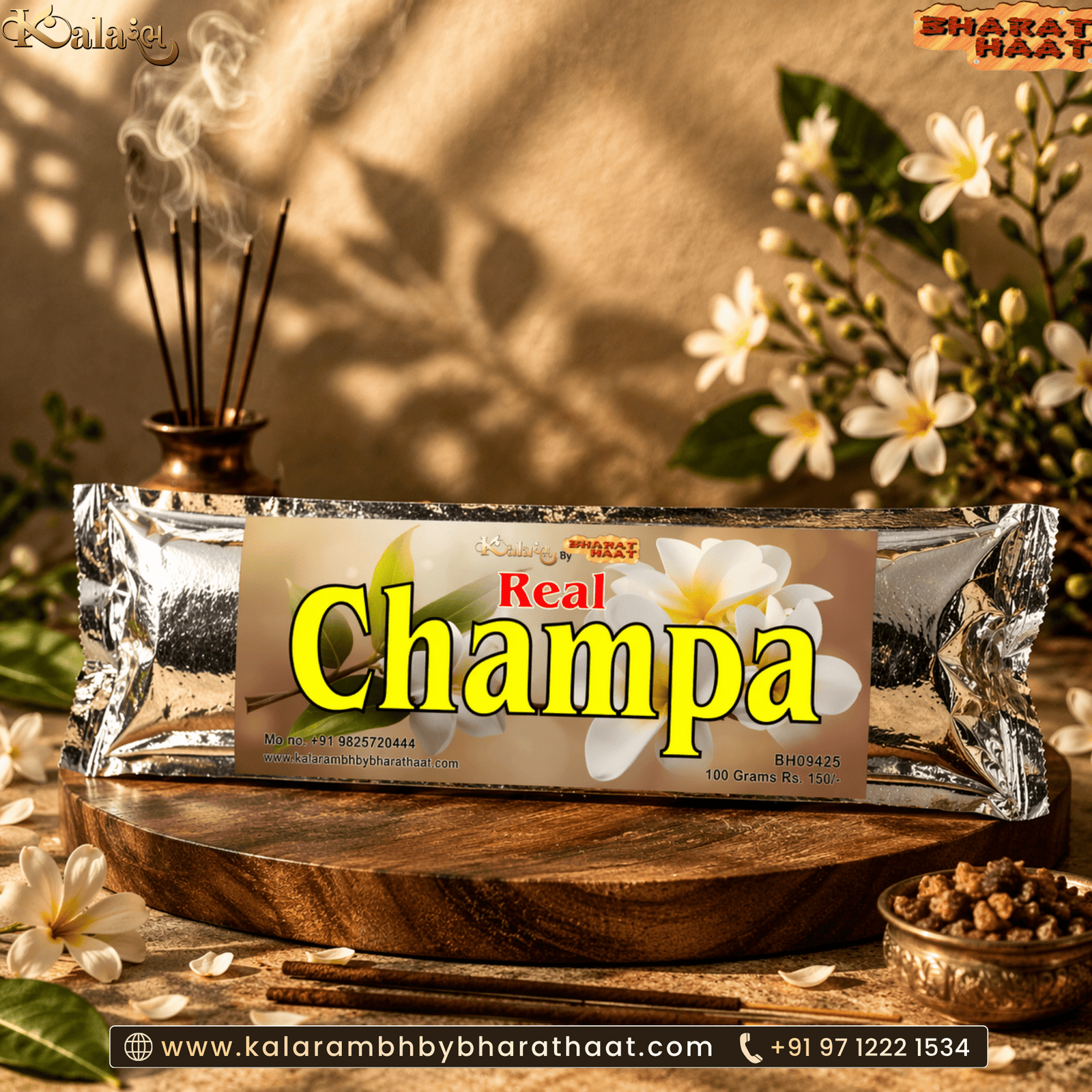 Indulge in the authentic fragrance of Real Champa with Kalarambh by Bharathaat’s premium Agarbatti Incense Sticks. Crafted meticulously to evoke the pure essence of Champa, these incense sticks offer a captivating and enduring aroma. Each pack contains 100 grams of meticulously crafted incense sticks, providing a long-lasting, fragrant experience. Elevate your space with the enchanting scent of Champa, known for its calming and spiritual properties. Enhance your meditation, create a welcoming ambiance, or simply unwind with the delightful fragrance of Real Champa.