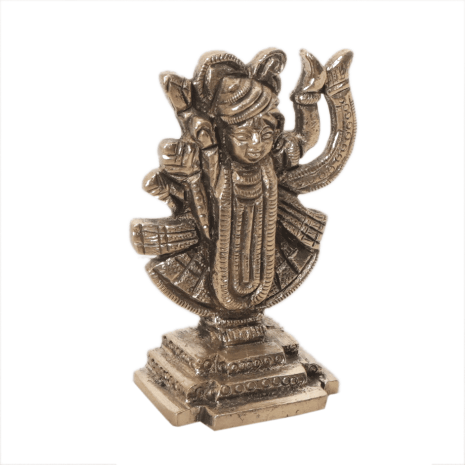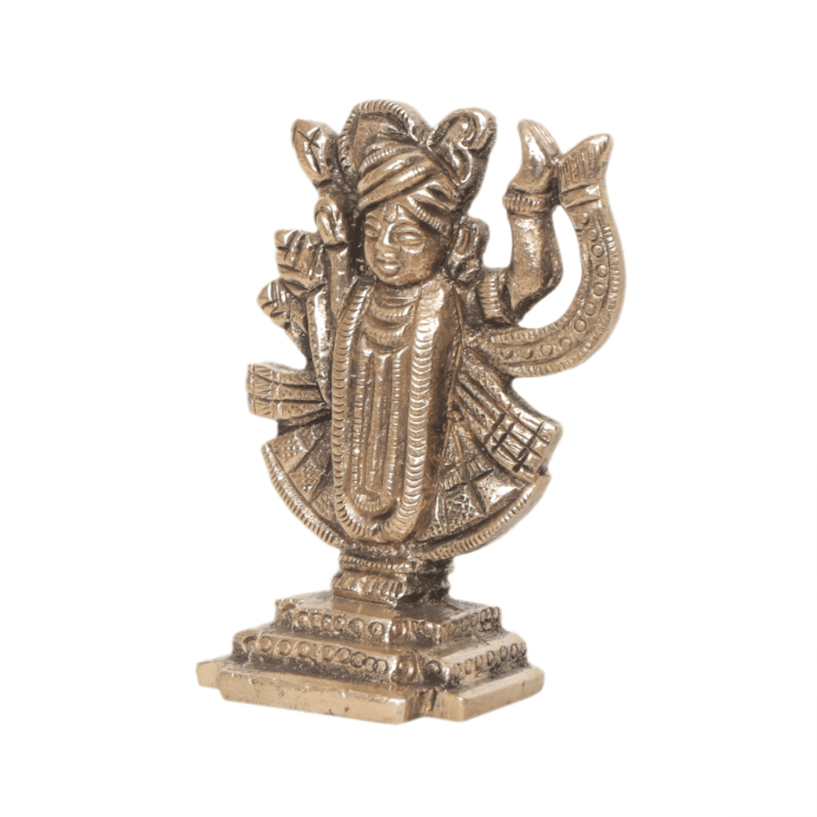 Expertly handcrafted from premium-quality solid brass, this mini idol features fine detailing and a smooth antique finish that reflects traditional Indian craftsmanship. Despite its compact size, the Shrinathji murti carries deep spiritual significance and is ideal for daily worship.