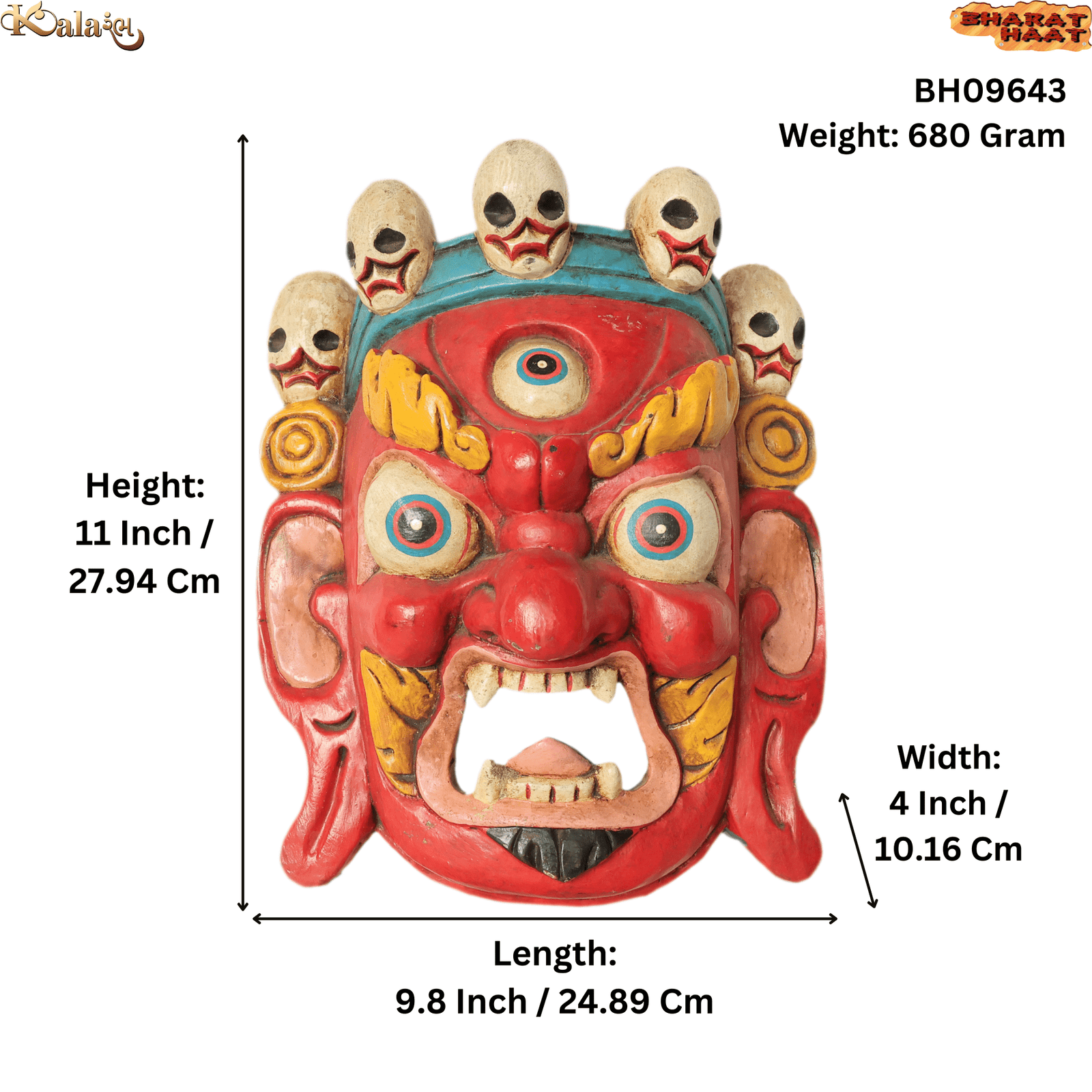 Expertly carved from high-quality wood, the Bhairab face features intricate detailing, expressive craftsmanship, and a traditional rustic finish. Measuring 9.8 x 4 x 11 Inch (24.89 x 10.16 x 27.94 cm) and weighing 680 grams, it is solid yet easy to mount on any wall. The detailed facial features and traditional artistic style make it a magnificent statement piece.